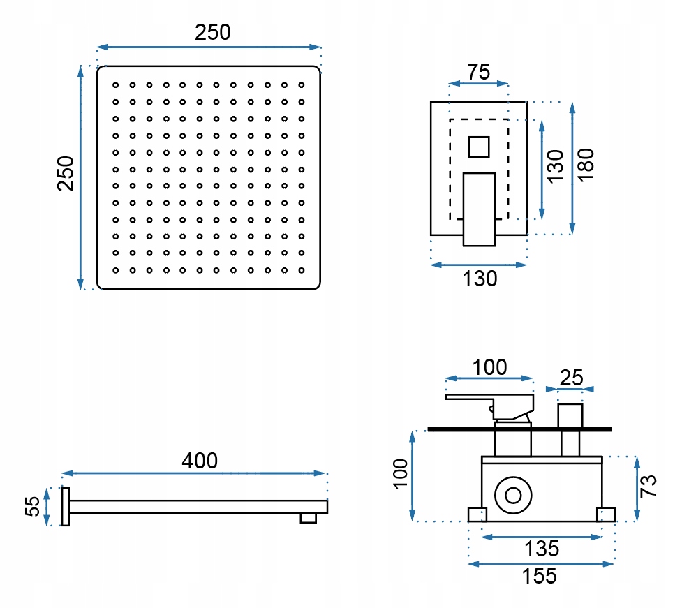 - У комплекті: Змішувач, душовий шланг з трубка, тропічний душ, вилив нижня частина інтегрована з корпусом