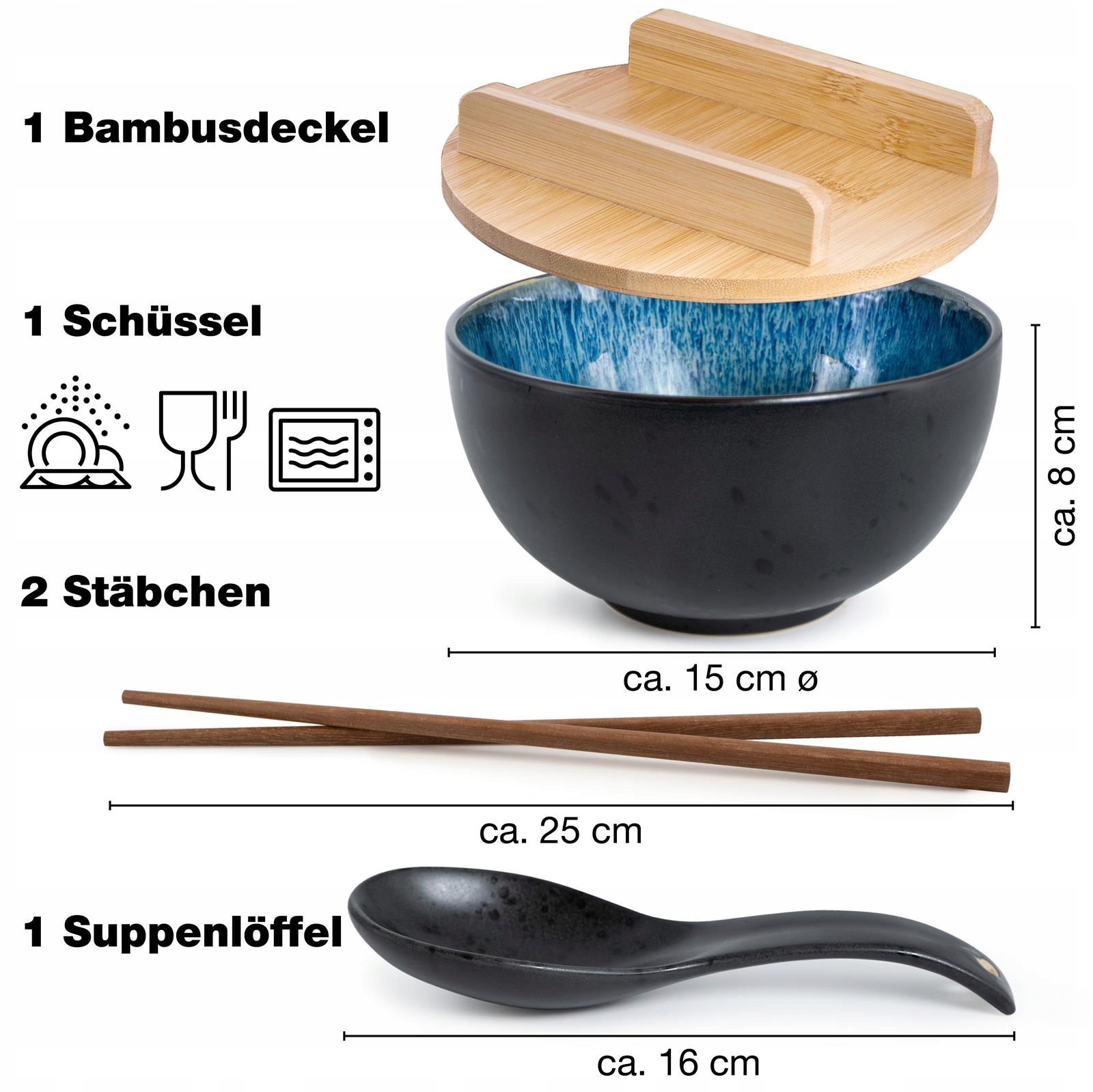 • ПОВНИЙ КОМПЛЕКТ Чаша для рамен Moritz & Moritz з кераміки з синьою реактивною глазур'ю всередині, входить. 1x ложка для рамену, 2x палички для суші та 1x кришка з бамбука, кожна діаметром 15 см і висотою 8 см для 600 мл супу або салату