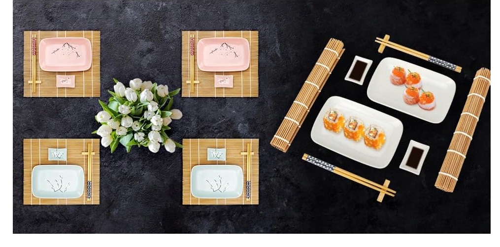 Набір для суші EXZACT 10 - це ідеальне поєднання східного стилю, високоякісних матеріалів і унікальної естетики. У набір входить усе необхідне для справжнього приготування суші вдома: 2 порцелянові тарілки, 2 миски для соусу, 2 бамбукові килимки, 2 підставки для паличок і 2 пари бамбукових паличок для їжі. Все це упаковано в елегантну подарункову коробку, що робить набір ідеальним подарунком для любителів японської кухні.