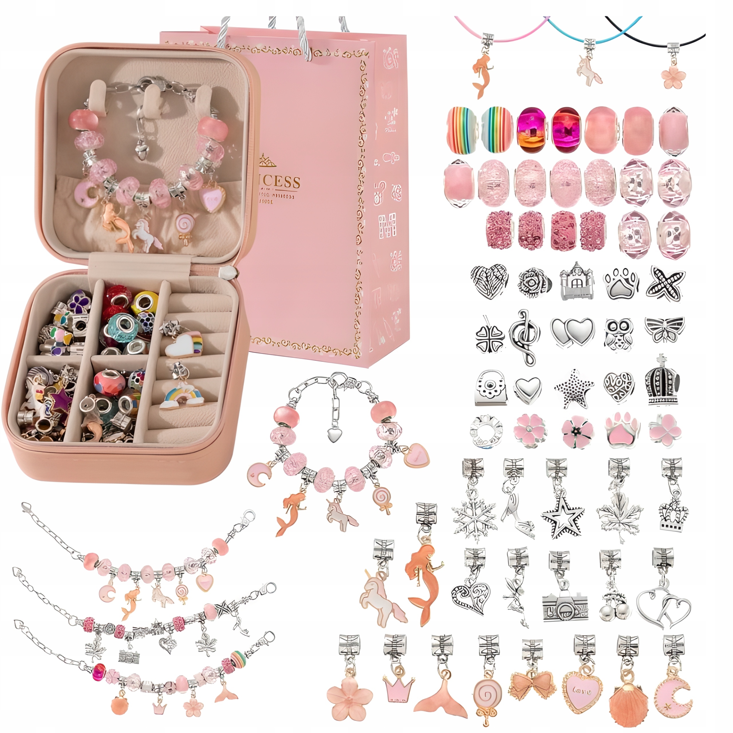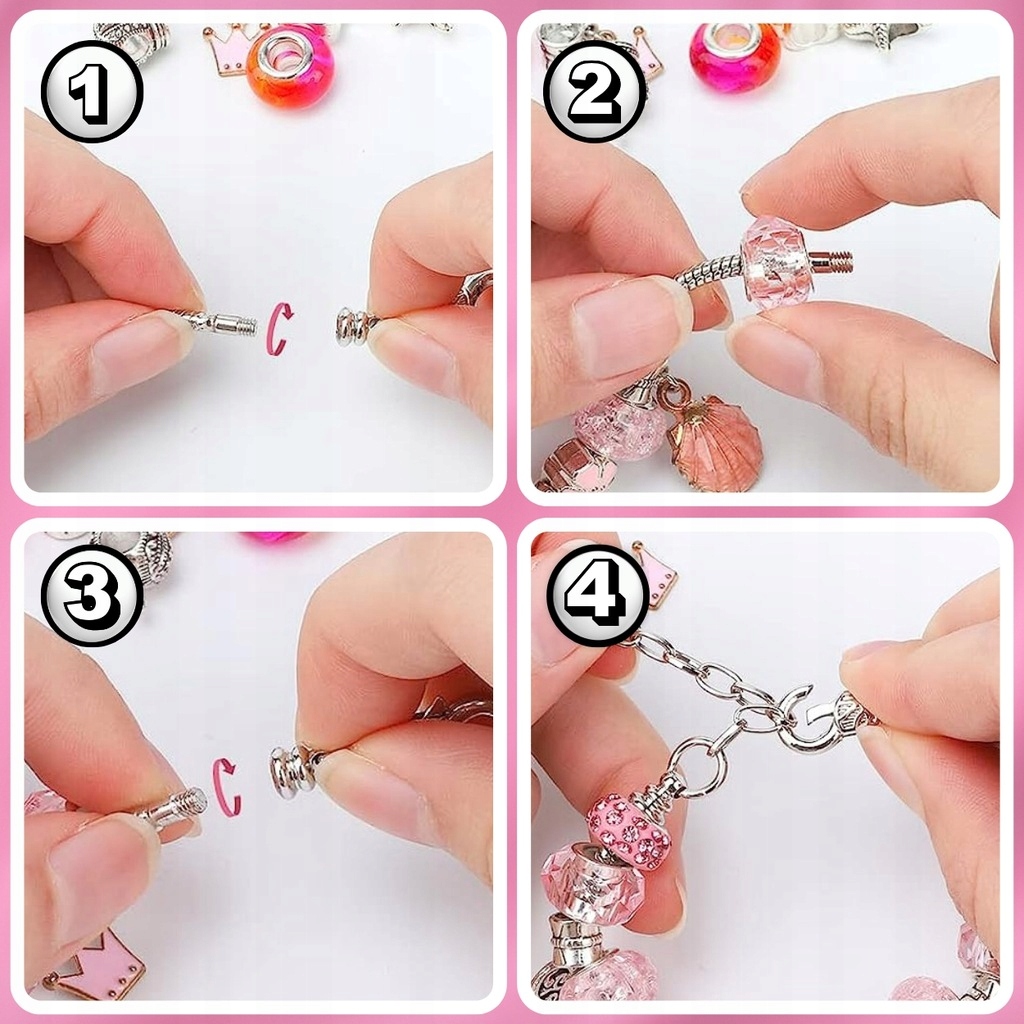Набір для виготовлення браслетів — це мрія кожного маленького дизайнера! Дайте їй можливість відчути себе справжньою художницею і створити прикраси своєї мрії. Цей набір містить усе, що потрібно маленькому дизайнеру, щоб зачаровувати світ своїми творчими проектами. Різноманітні намистини, такі як красиві веселки, корони, крила ангела та багато інших, чекають, щоб їх виявили та використовували для створення браслетів, намист і підвісок. Дитина матиме необмежену свободу в створенні та адаптації прикрас відповідно до свого смаку та уяви.