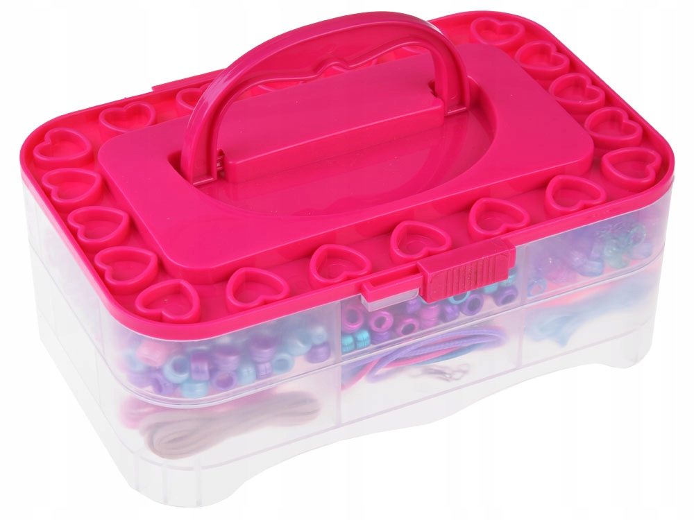 У набір входить прозорий пластиковий футляр з відділеннями і дзеркалом, в якому можна зберігати невикористані аксесуари для виготовлення прикрас і готові прикраси. Завдяки ручці чохол можна легко перенести в інше місце. Чохол складається з двох елементів. Щоб розгорнути кейс, відкривши кришку, поверніть два рожеві захисні пристрої всередині коробки.