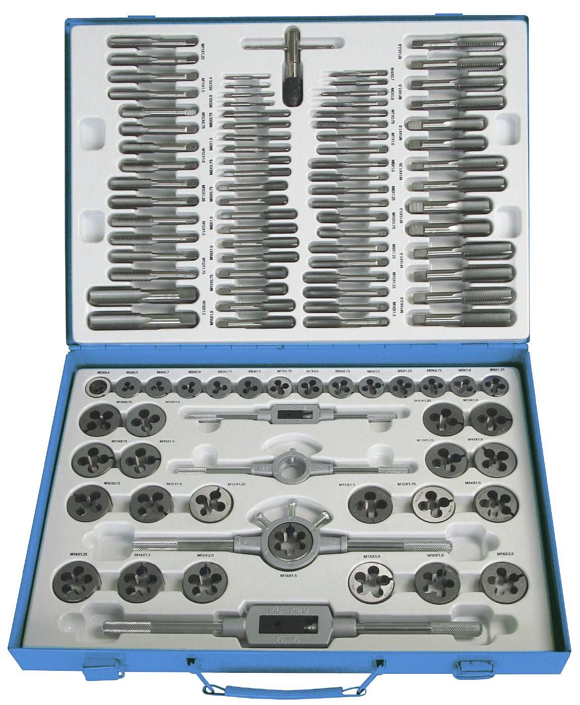 Набір із 110 деталей. Включає 2 круглі тримачі матриці, 2 регульовані ручки мітчика та 1 тримач мітчика. Мітчики і плашки виготовлені з легованої інструментальної сталі. Розміри мітчиків від M2 x 0,4 до M18 x 1,5. Розміри матриць від M2 x 0,4 до M18 x 1,5. Для ремонту різьби.