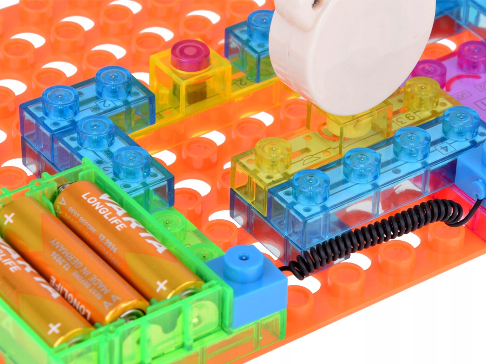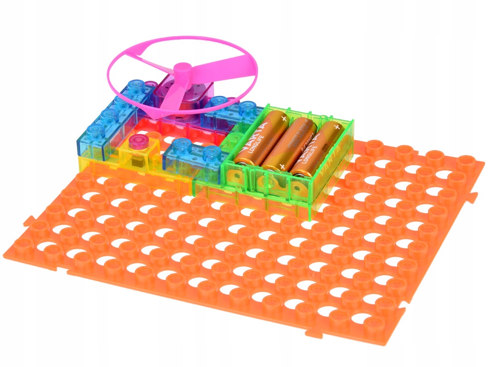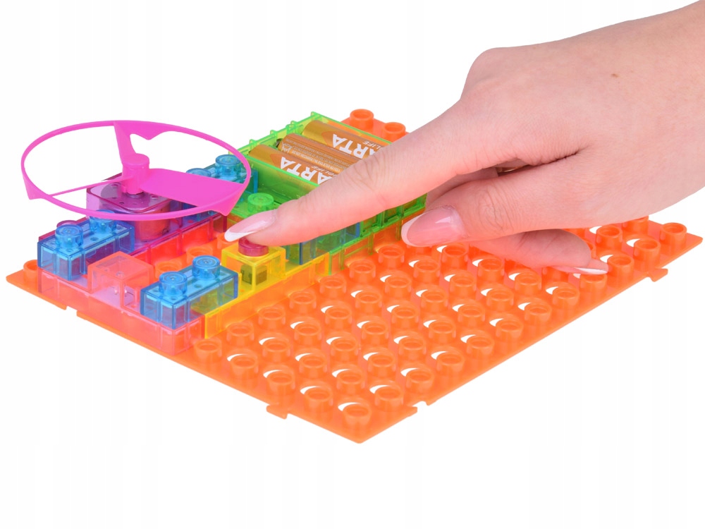 - Поєднуючи відповідні блоки, дитина може зрозуміти, як відбувається електрика, і ефект може бути справді вражаючим – елементи починають обертатися та світитися, що додає додатковий вимір розвазі. Завдяки набору можна створювати проекти, в яких звук супроводжує обертові елементи або світяться діоди.