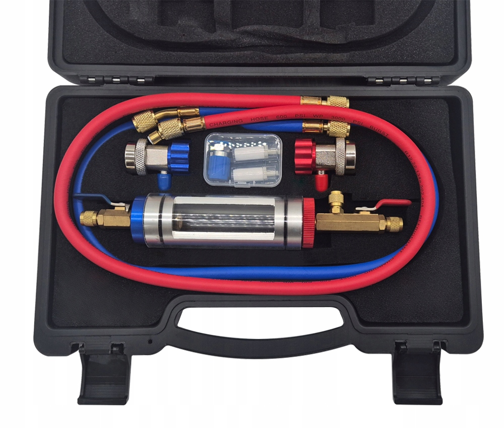 Спеціальний набір для оцінки чистоти нафти в системі кондиціонування. Завдяки прозорому циліндру ми можемо побачити внутрішню частину системи кондиціонування та перевірити ступінь змішування олії з холодоагентом та наявністю УФ -барвника.