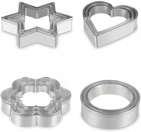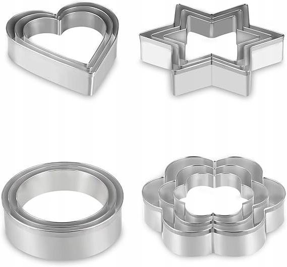 Набір форм для випічки з нержавіючої сталі, призначений для нарізання печива та декорування страв. Набір містить 12 елементів у 4 формах: зірка, серце, квітка та коло, у 3 розмірах. Безпечний для харчових продуктів матеріал, стійкий до високих температур.