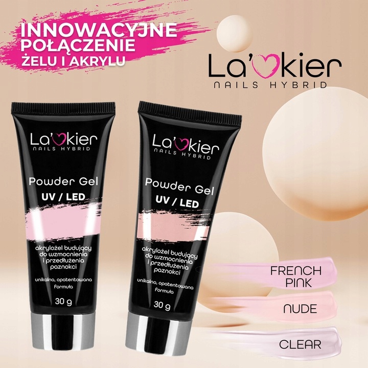 Acrylic Gel La'kier — єдиний такий продукт із консистенцією мусу, міцністю акрилу та еластичністю гелю. Густа консистенція дозволяє експрес моделювати та укладати нігті. Використовуючи Dual Form (бланки багаторазового використання), ви заощадите 85% свого робочого часу. Ідеально підходить для затягування тунелю (після 10 секунд затвердіння в лампі)