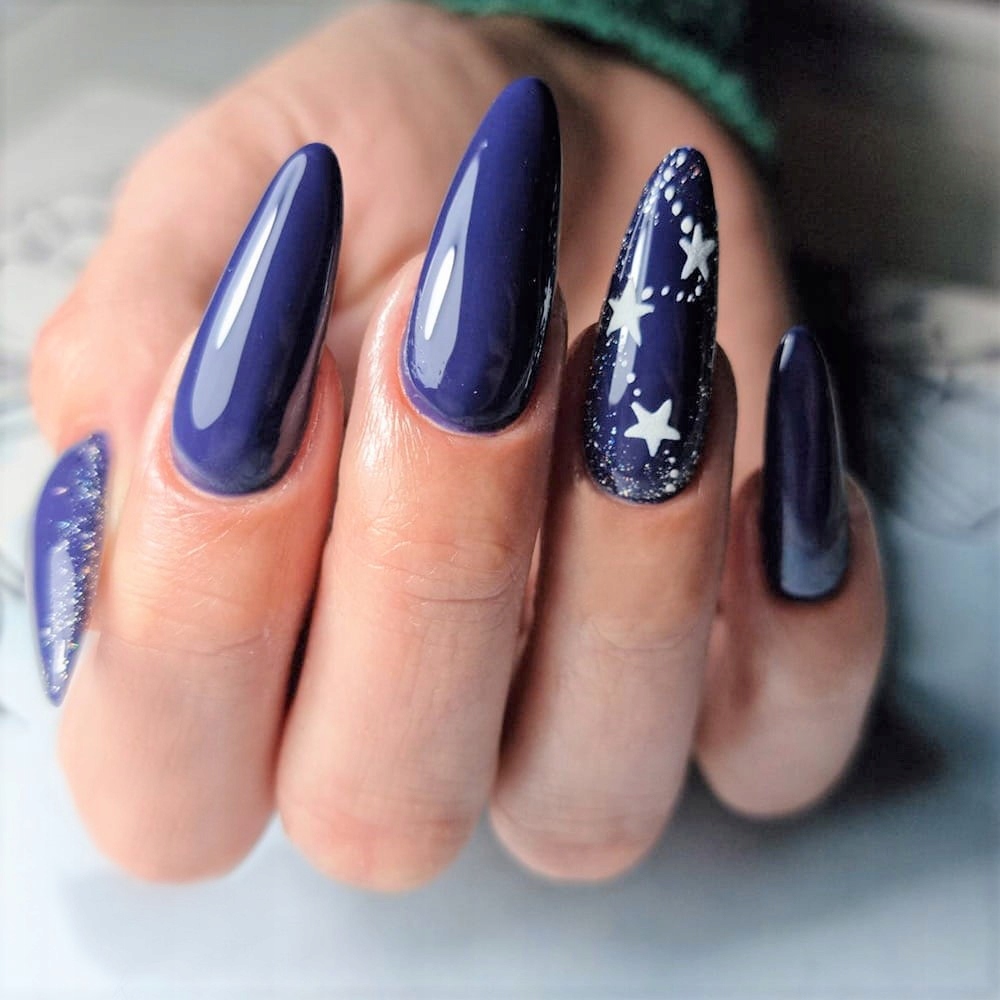 Зимові нігті чудово виглядають із зірковими прикрасами або додаванням блиску.