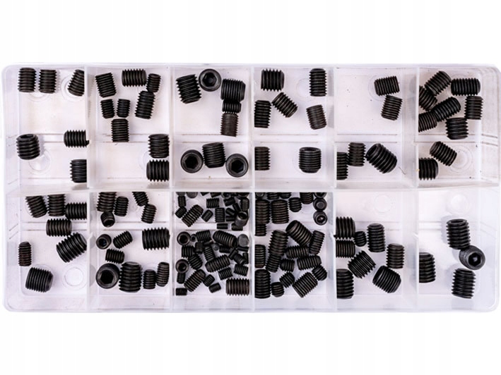 Набір складається зі 160 шт. шестигранних гвинтів. У комплект входять гвинти різних розмірів, що робить його універсальним у використанні. Гвинти розсортовані в зручному пластиковому органайзері. Коробка полегшує зберігання та транспортування шурупів. Крім того, контейнер оснащено ручкою, яка дозволяє його підвішувати, наприклад, на дошці для інструментів.