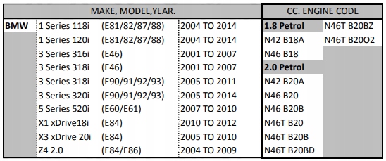 Для 118i/120i (E87), 318i/320i (E90) і Z4 2.0 (E85), а також 316i/316ti Compact (E46) і 318i/318ti Compact (E46) з двигунами N42 і N46.