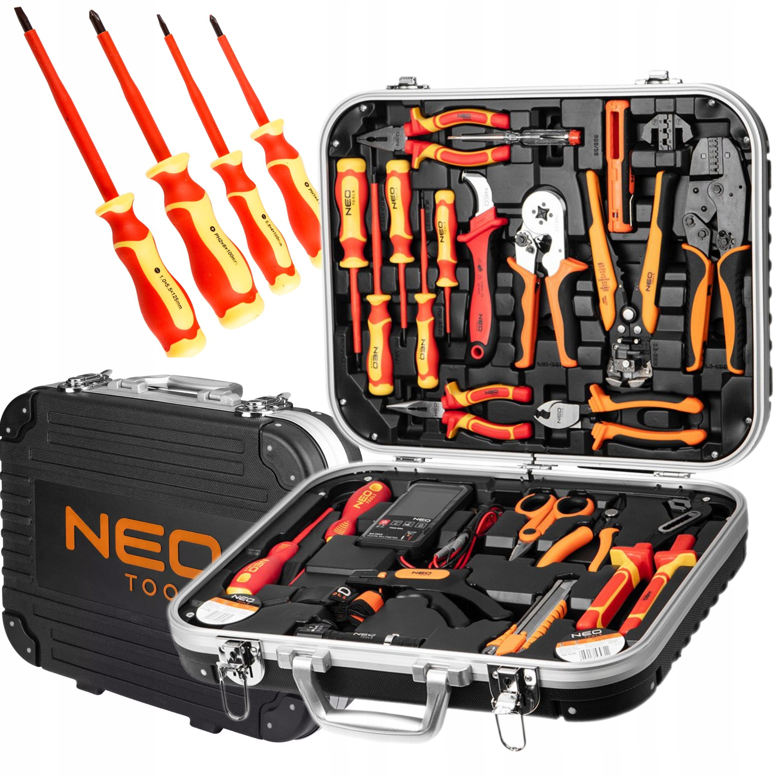 Neo Tools 2.0 Electrics валіза - це повний набір з 25 інструментів, ідеально для професіоналів, які потребують універсального та надійного обладнання. містять різні плоскогубці, включаючи універсальні, розширені прямі, для труб та точної сторони, а також кабельного різака та два типи ізоляційних знімачів - автоматичні та ручні. Комплект також включає пару плоскогубців для затискаючих наконечників, нож 1000 В для зняття ізоляції та пробовідбірника електричної установки 250 В.