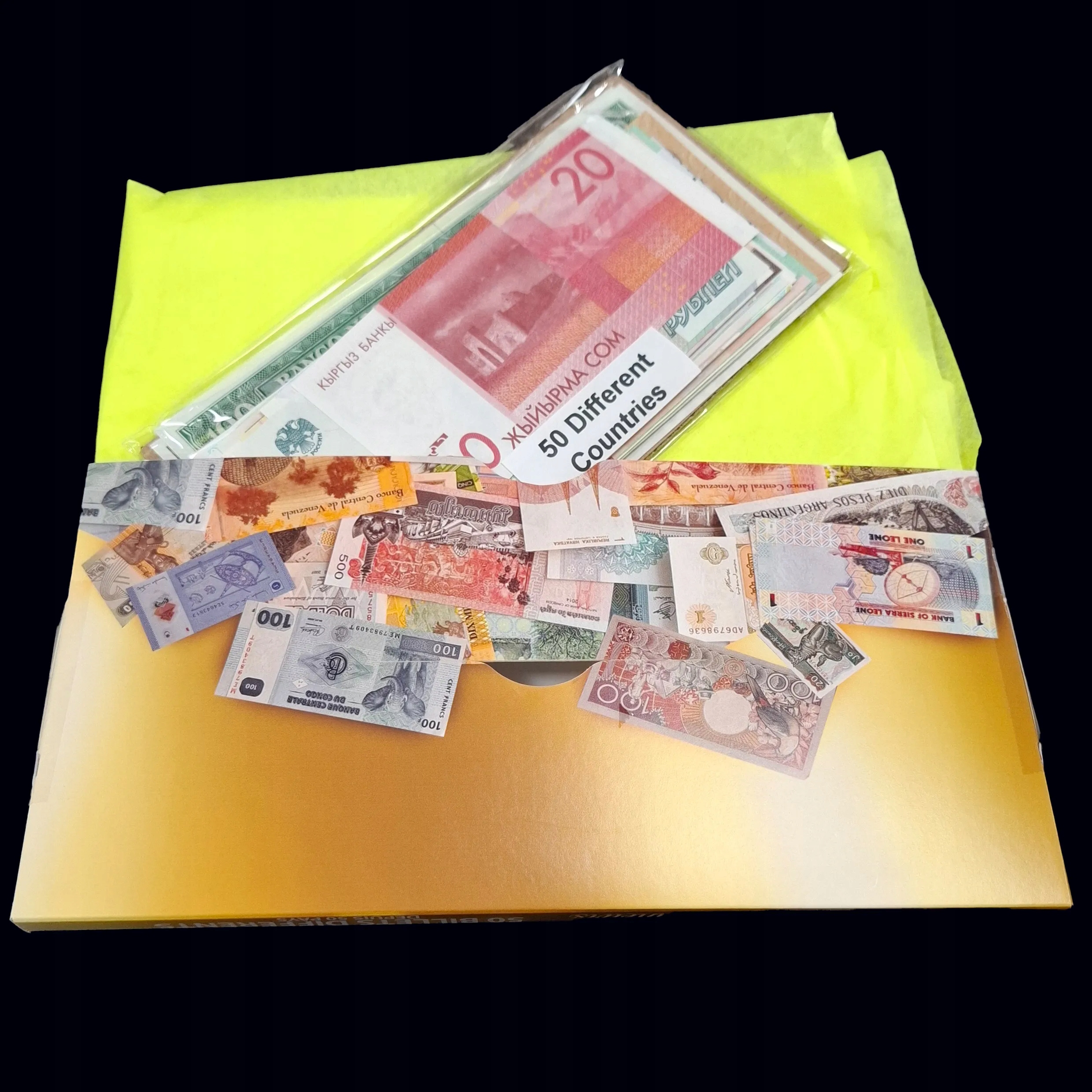 Набір із 50 предметів оригінального світу купюри прямо з пакетів. банкноти (ніколи не були в обігу), упаковані в стильну картонну коробку.
