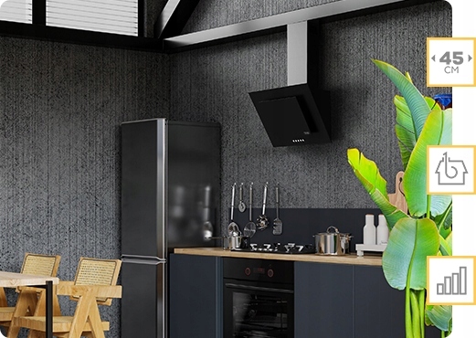 Витяжка з чорного скла підвищує естетичну цінність Вашої кухні. Скляна елегантність підійде до будь-якого стилю облаштування, а стійкість загартованого скла до механічних і термічних пошкоджень, а також легкість очищення гарантують безпроблемну експлуатацію протягом багатьох років.