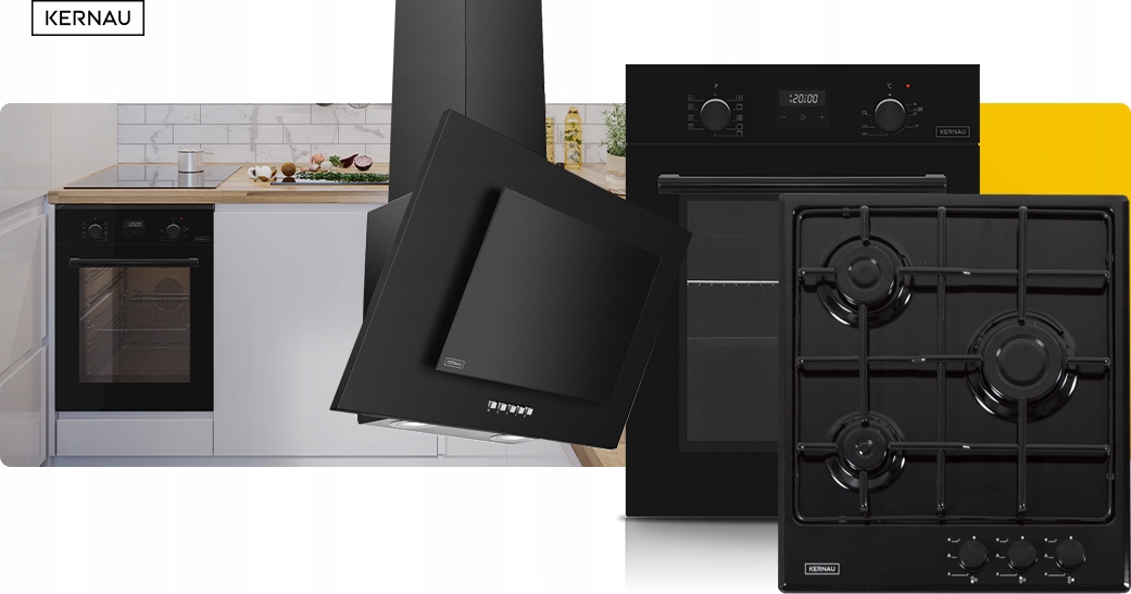 Набір Kernau SLIM шириною 45 см, що складається з газової плити KGH 4346 B, електричної духовки KBO 0946 SK B та настінної витяжки KCH 0250B
