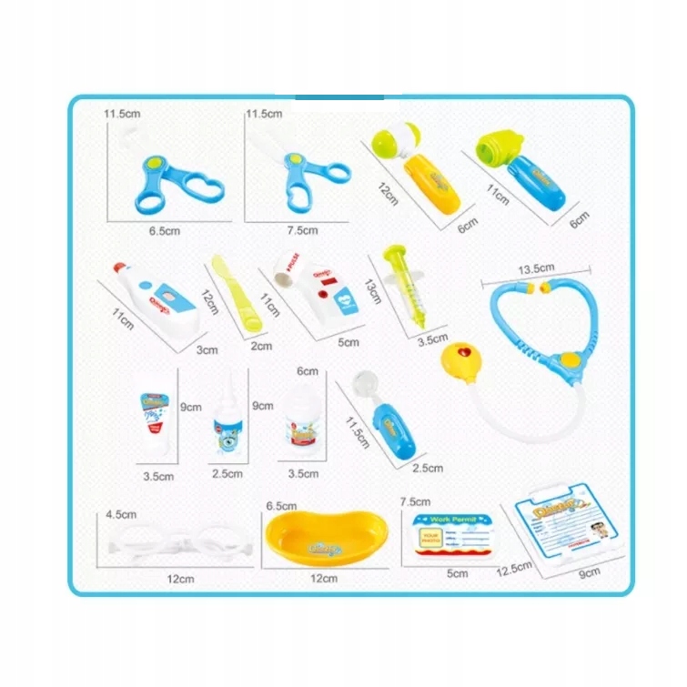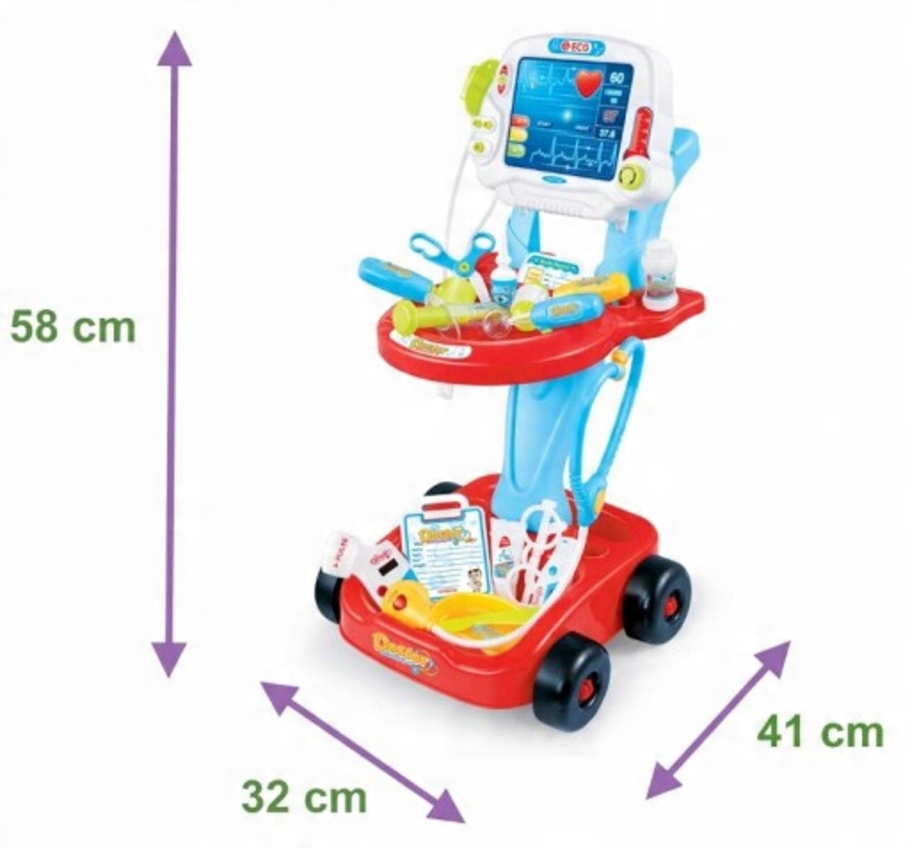- Набір лікаря — одна з улюблених іграшок дітей. Завдяки цій іграшці ваша дитина навчиться дбати про здоров'я своїх близьких. Це чудова розвага, а також форма навчання. Набір дуже барвистий і має багато аксесуарів. Виріб безпечний, не має гострих країв, елементи адаптовані під ручки дитини, що дозволяє їх легко хапати і тримати. Набір складається з 17 елементів, які розміщуються в зручному та легкому візку на 4 колесах. Докторські аксесуари та 2-рівневий візок з імітацією екрана ЕКГ і ручкою дозволяють різноманітно і багаторазово грати. Завдяки тому, що коляска оснащена колесами, ви легко можете взяти іграшку в іншу кімнату, сад або навіть на прогулянку.В набір входять такі елементи, як: стетоскоп, отоскоп, пульсометр, термометр, дзеркало стоматологічне, молоток неврологічний, шприц, ножиці, щипці, очні краплі, мило для рук в тюбику, миска, скальпель, окуляри без лінз, пляшечка, бейдж на кліпсі з місцем для написання імені і прикріпіть фото, а також пластиковий блокнот з можливістю повісити.