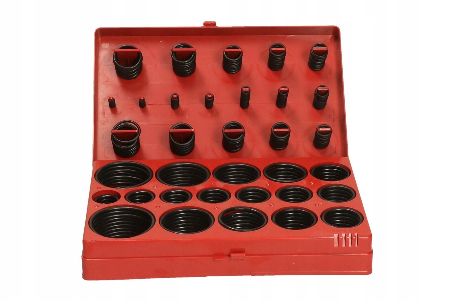 Набір із 419 ущільнювальних кілець із NBR. У набір входять розміри від 3х1,5 мм до 50х3,5 мм. Все було поміщено в зручну упаковку типу «сортер».