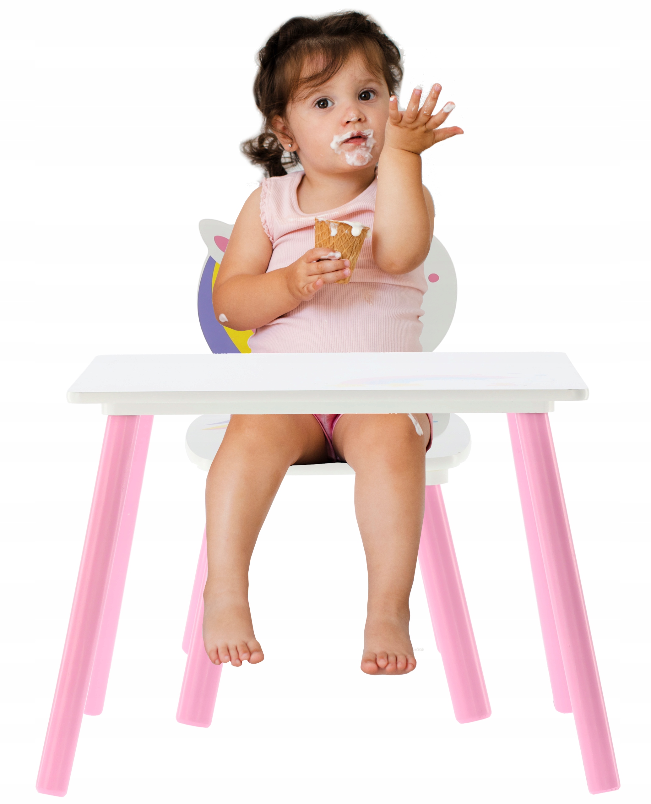 Білий столик з веселковим візерунком з масиву дерева - ідеальні меблі для кожної дитини. Стіл стане місцем, де ваша дитина буде створювати дивовижні витвори мистецтва. Саме за цим столом вона почне розвивати свої творчі здібності. У набір входять два стільці стилізовані під єдинорогів з райдужною гривою. Ніжки зроблені з сосни, а сидіння - з МДФ. Розміри набору ідеально підходять для дітей віком близько 3 років.