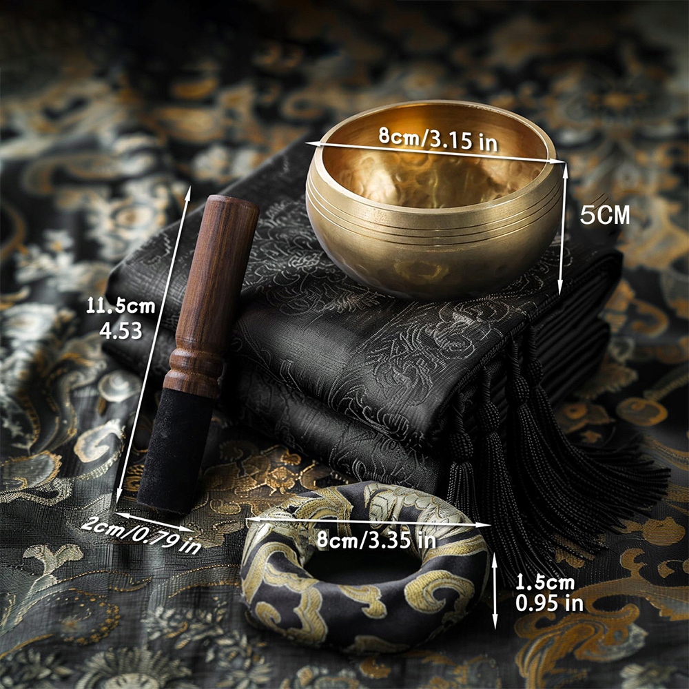 Наша миска для співу медитації має діаметр 8 см. Він містить чашу з медитацією, кільце -семінське кільце у формі кільця і молотка.