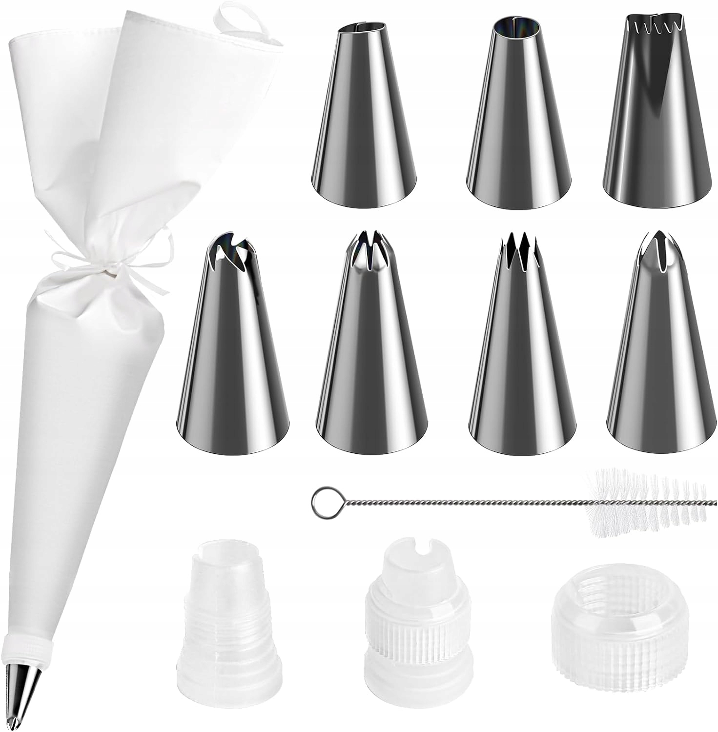 - Багато аксесуарів для випікання - цей набір включає 1 багаторазовий мішок для кондитерських виробів, 7 різних наконечників із нержавіючої сталі, 1 невелику щітку та застібки для кондитерських мішків.