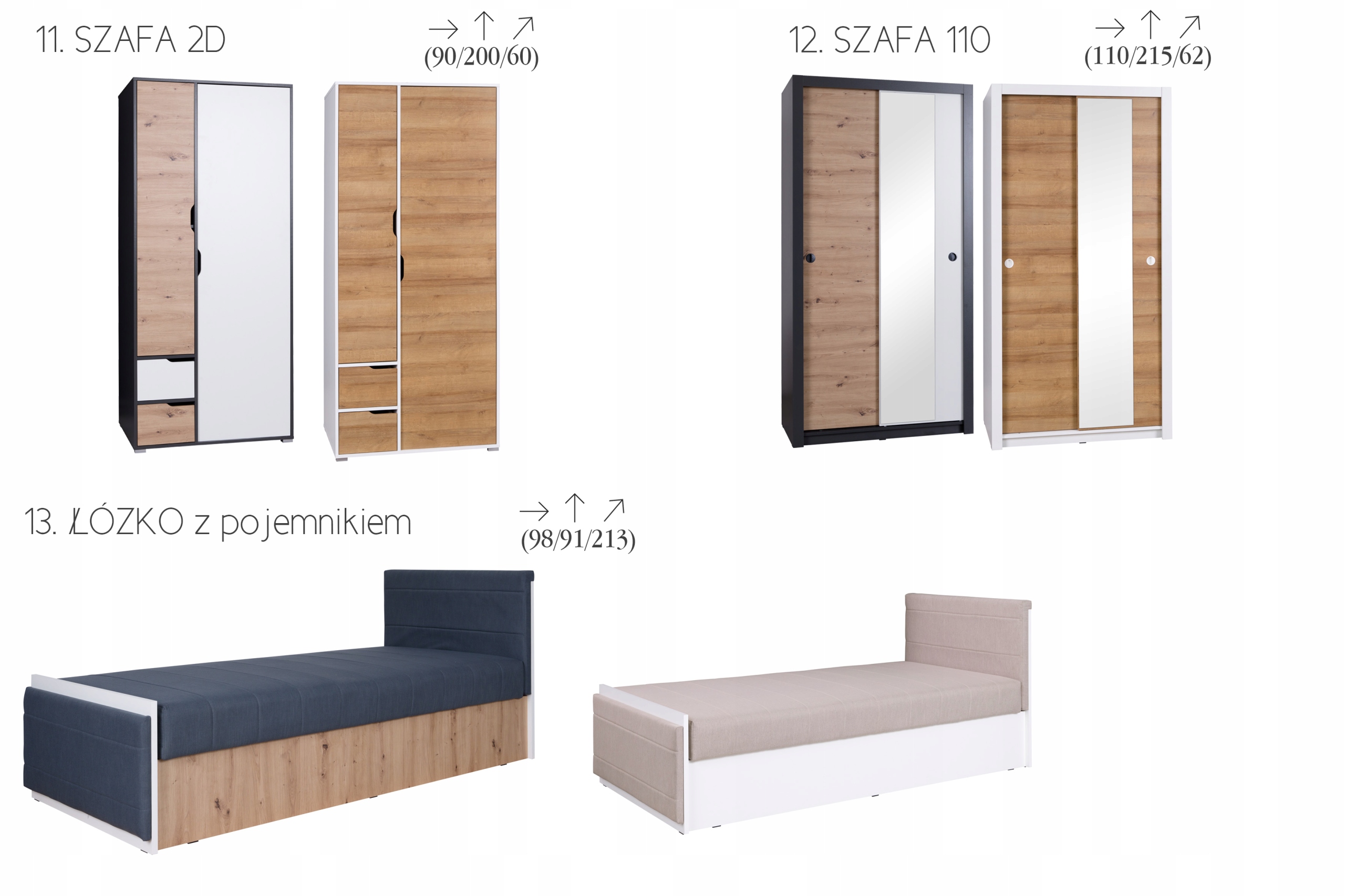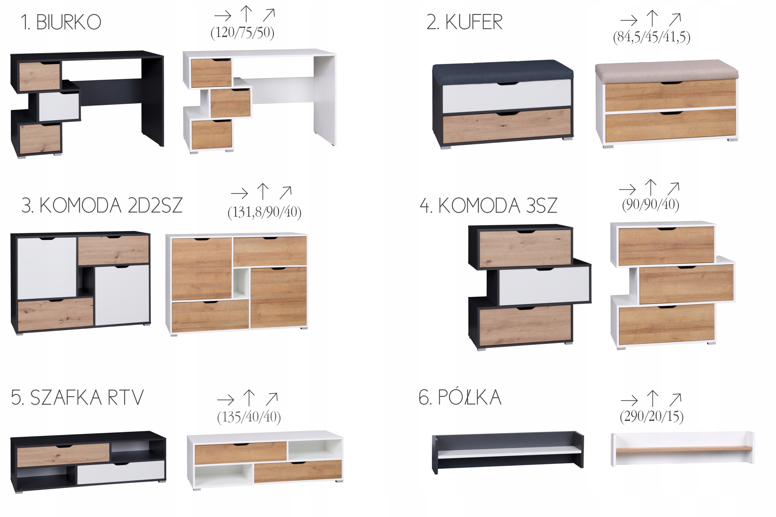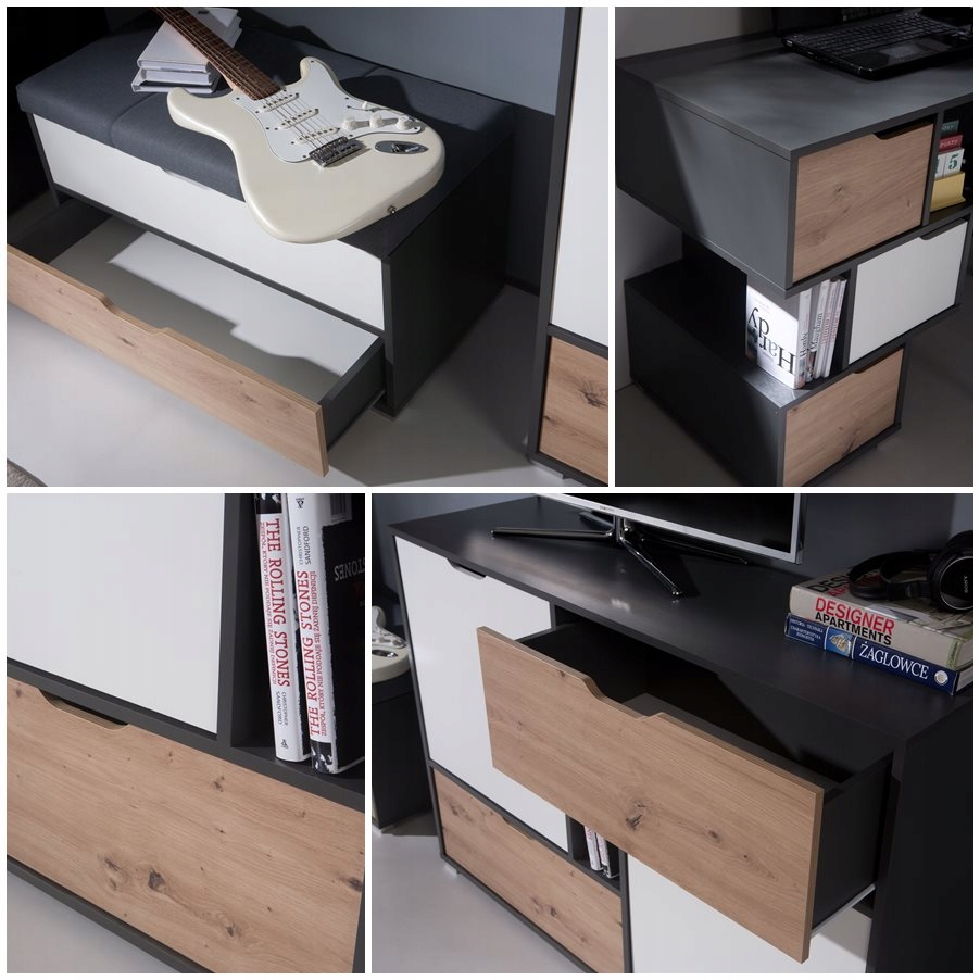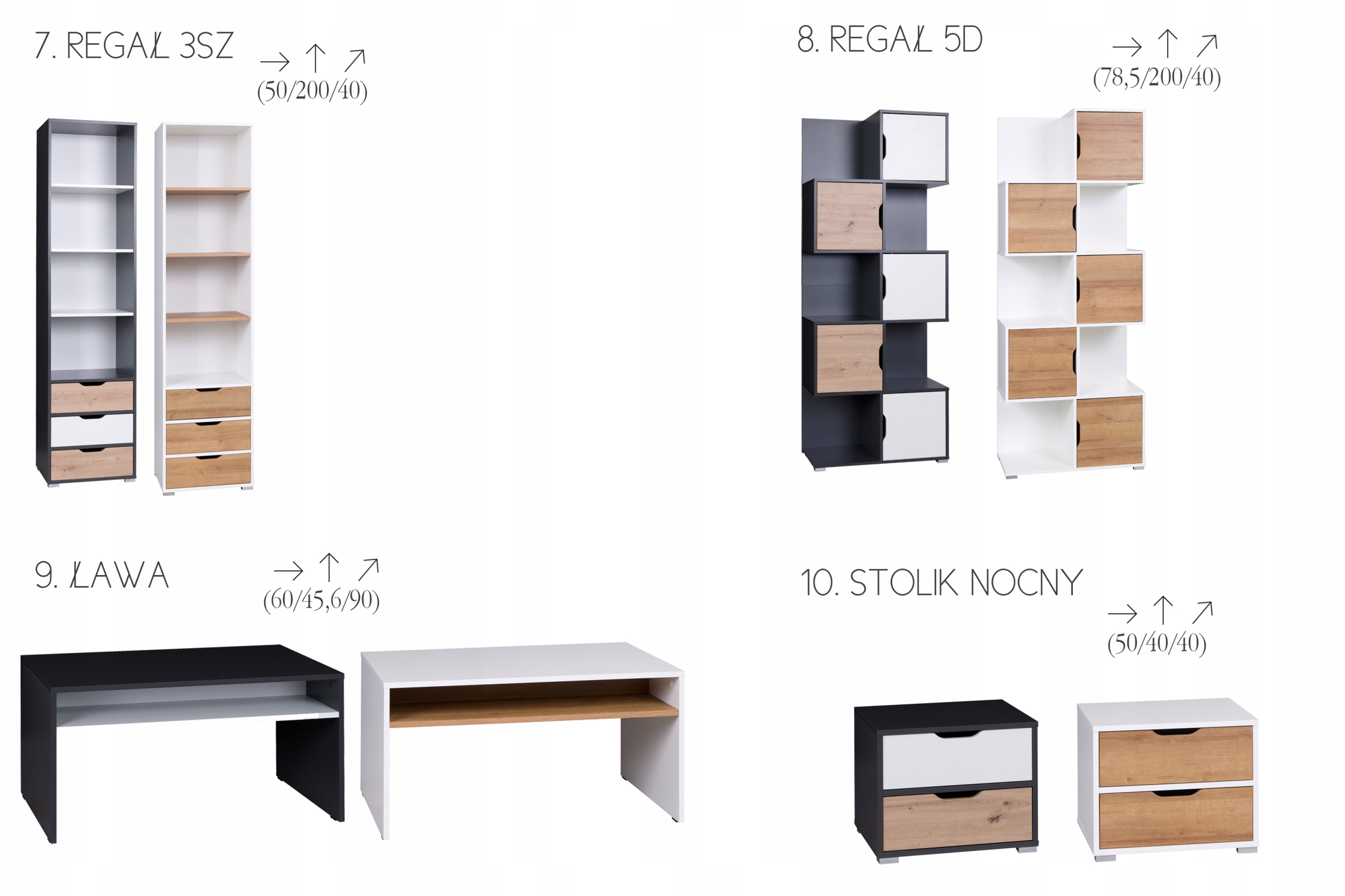 Це колекція, присвячена молоді, але ці меблі яскравих кольорів також чудово підійдуть у вітальні. Меблі в двох темних кольорах: графітовий корпус у поєднанні з білим і ремісничим дубом на фасадах; і світлі білі тіла та золотий дуб на фронтах. Світлі кольори внесуть в інтер’єр ковток свіжості та спокою, а темні дозволять трохи божевілля та пограють на контрастах.