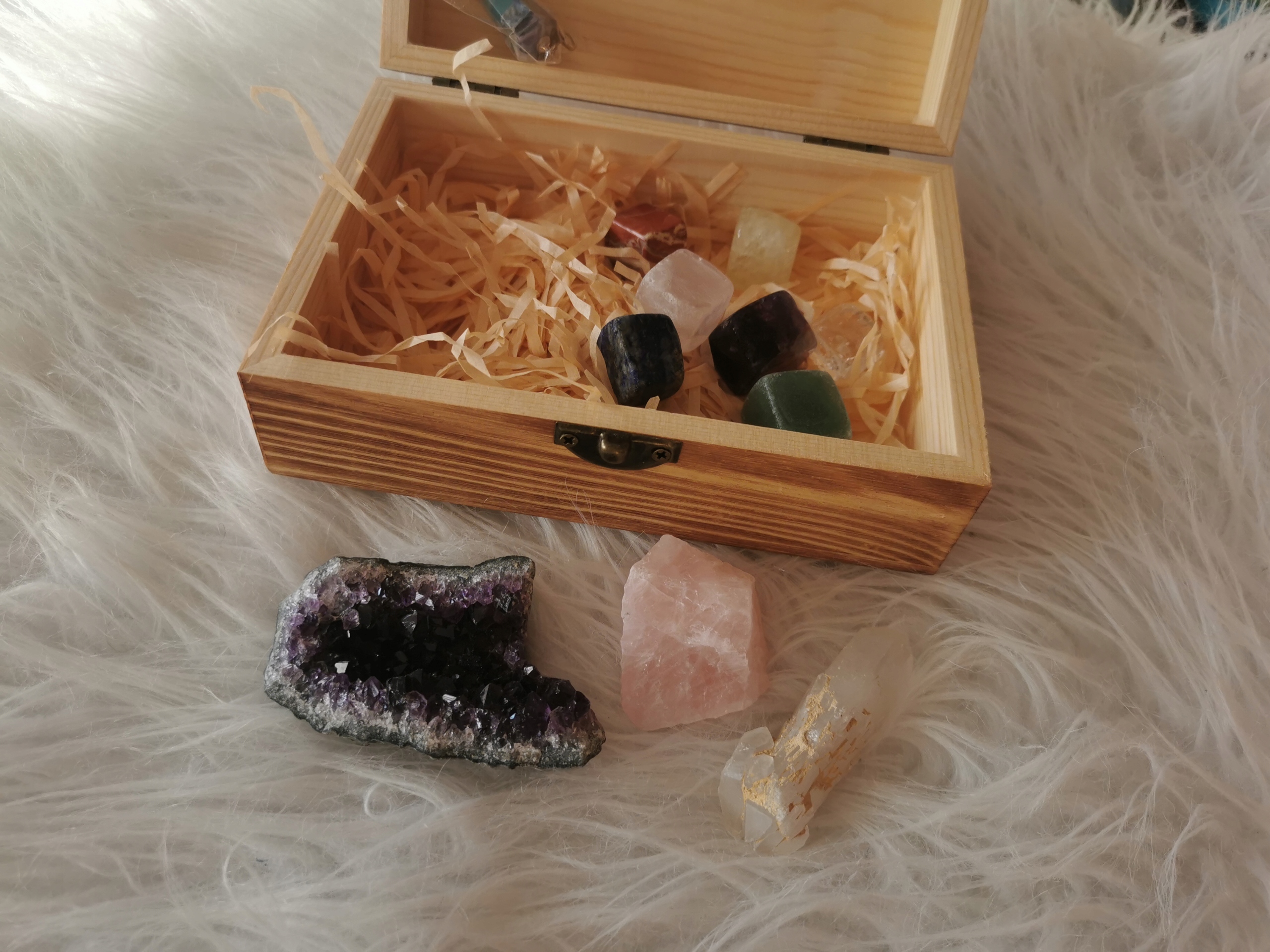 Чудовий набір каменів у гарній дерев'яній коробці з маятником на ланцюжку.