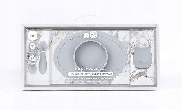 The First Foods Set американського бренду EZPZ (вимовляється ізіпізі) — ідеальний перший набір посуду для вашої дитини, виготовлений з унікального силікону. Він розроблений фахівцем з логопедії та дитячого харчування, тому його розмір і форма ідеально відповідають ротовій порожнині та потребам маленької дитини. Цей інноваційний посуд був розроблений, щоб допомогти вашій дитині навчитися їсти та пити самостійно. Крім того, окремі елементи набору сприяють розвитку мовленнєвого апарату та дрібної моторики дитини. Призначені для дітей від 4 до 6 місяців (залежить від рекомендацій педіатра, коли краще починати розширювати раціон дитини).
