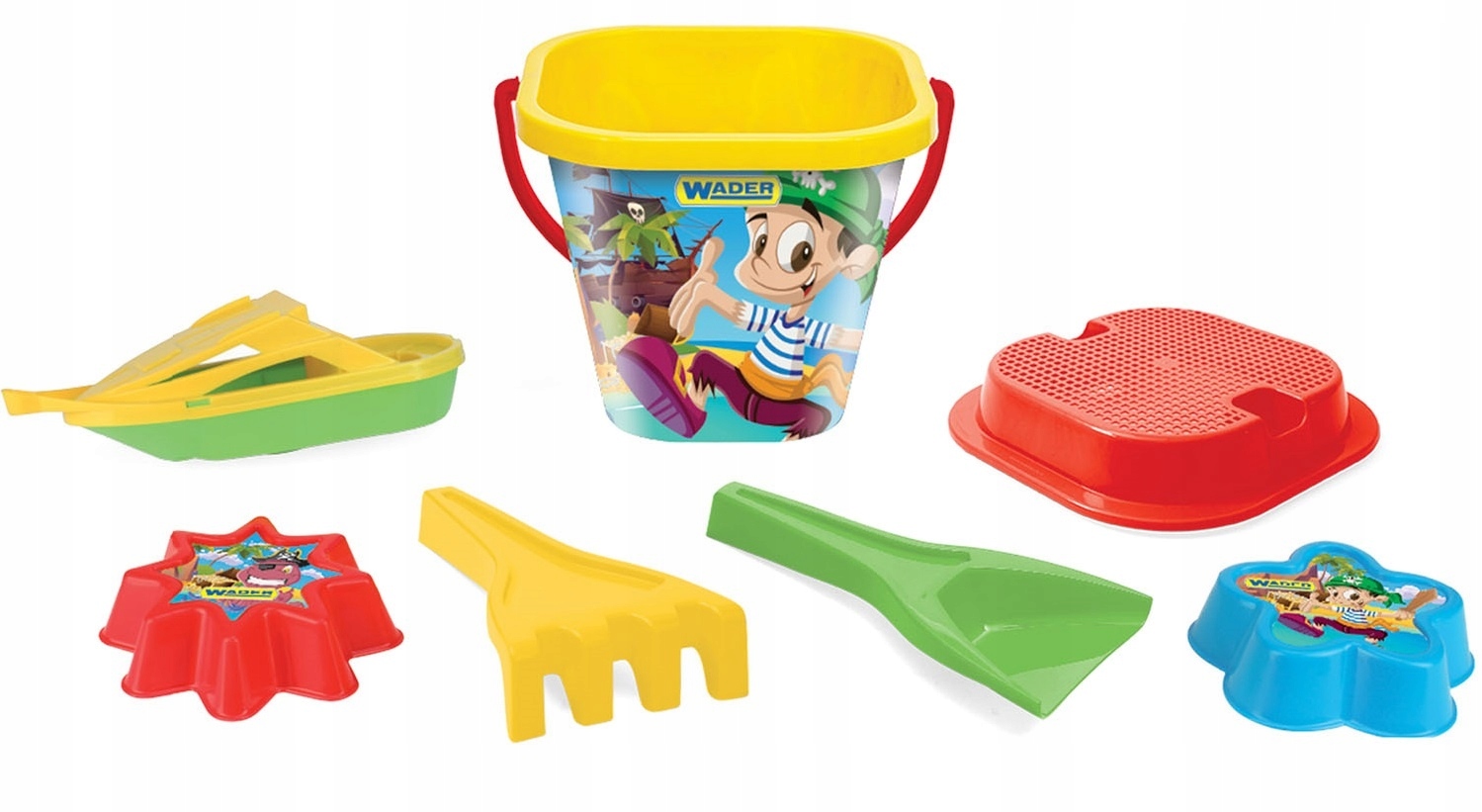 Літній набір, який складається з: квадратного відра з ємністю 2 л, лопатками, захопленням, ситечком, двома формами та необов'язковим шліфувальним або моторним човником. Відро та форми прикрашені наклейками, виготовленими в технології IML, а це означає, що вони постійно пов'язані з іграшками, а не розривати і не відшаровуватися під впливом води або температури. Іграшки дуже барвисті та довговічні. Кожен з наборів (з шліфувальною машиною або з моторним човником) має різний колір окремих елементів.