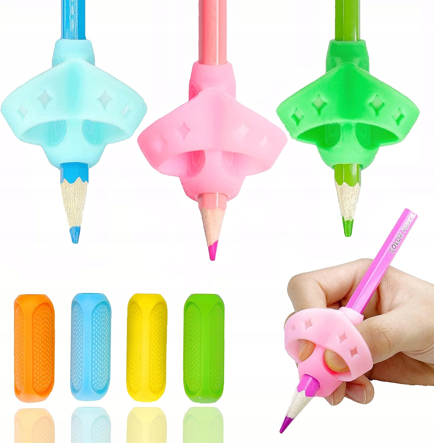 - Спеціальний набір UWinsic для дітей: ефективний набір для олівців містить – 2 типи. Тип 1 – 4 кольорові підставки для олівців з трьома пальцями; тип 2 – 4 кольорові прямокутні підставки для олівців. Розроблено, щоб задовольнити потреби дітей на різних етапах письма.