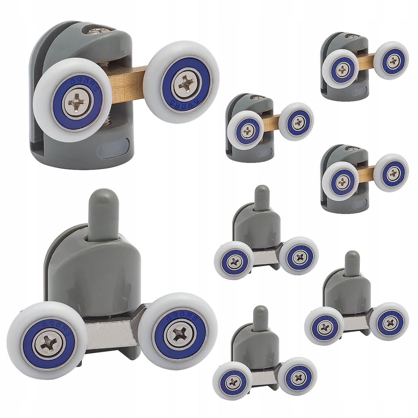 Подвійні ролики для душової кабіни в комплекті з чотирьох нижніх і чотирьох верхніх роликів. Всі колеса мають розмір 20 мм. Використання рухомого штифта означає, що ролики можна встановлювати як у квадратних, так і в напівкруглих кабінах. Верхні ролики регулюються за допомогою регулювального гвинта, а нижні регулюються самостійно завдяки пружинній кнопці. Крім того, основною перевагою подвійних роликів в душовій кабіні є плавне і стабільне відкривання дверей кабіни. У випадку з подвійними роликами двері не замикаються, як це відбувається з одинарними роликами. Кожен ролик з цього набору монтується в отвір діаметром 10-12 мм. Центр отвору повинен бути на відстані 19-20 мм від краю скла. Відповідна товщина скла для даної моделі роликів 4-6 мм.