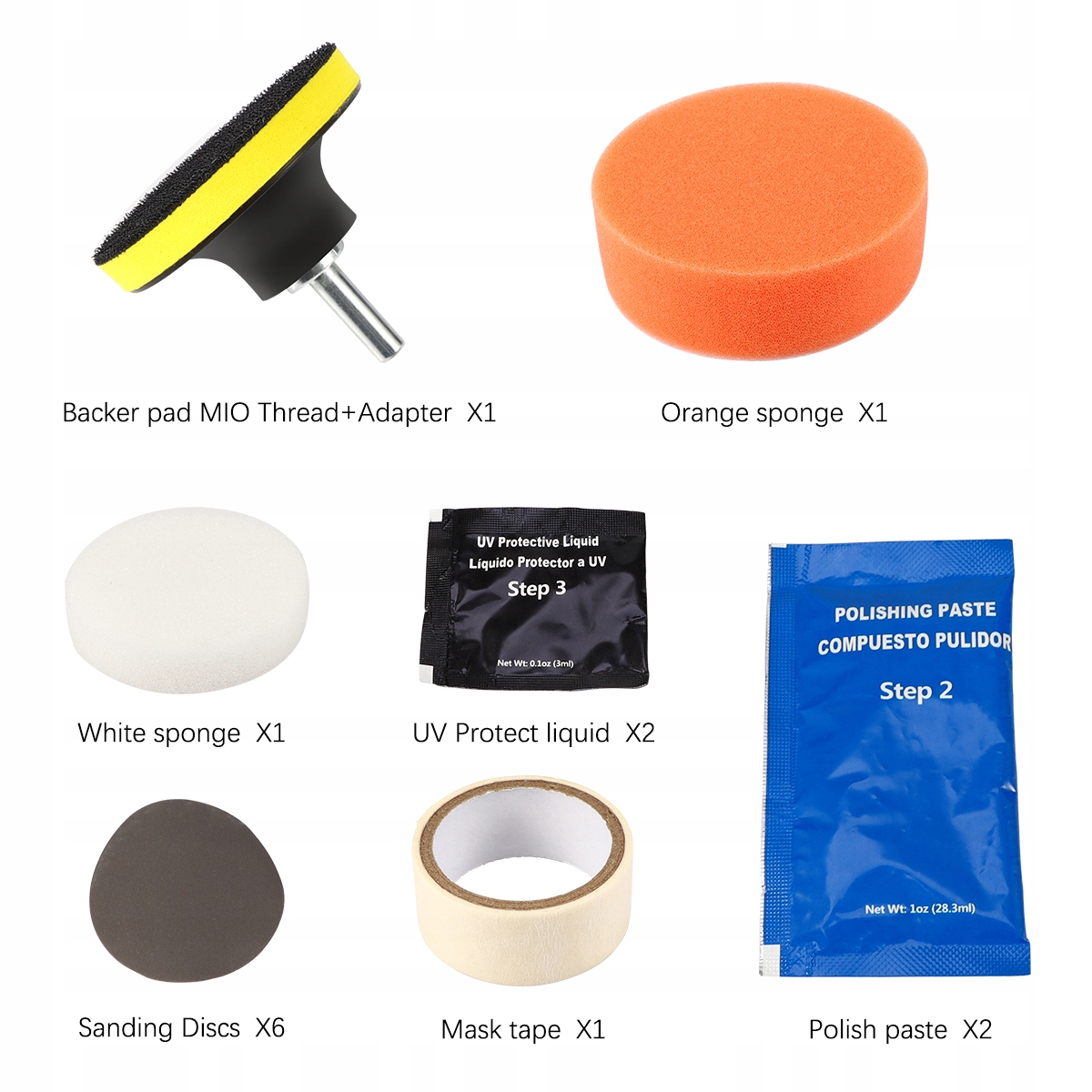 Ремонтний набір не включає побутову полірувальну машину. Цей продукт не ефективний для інших проблем, окрім глибоких подряпин, тріщин, плям всередині абажура та пошкодження поверхні. (Цей продукт краще підходить для машинного полірування, можливе також ручне полірування)