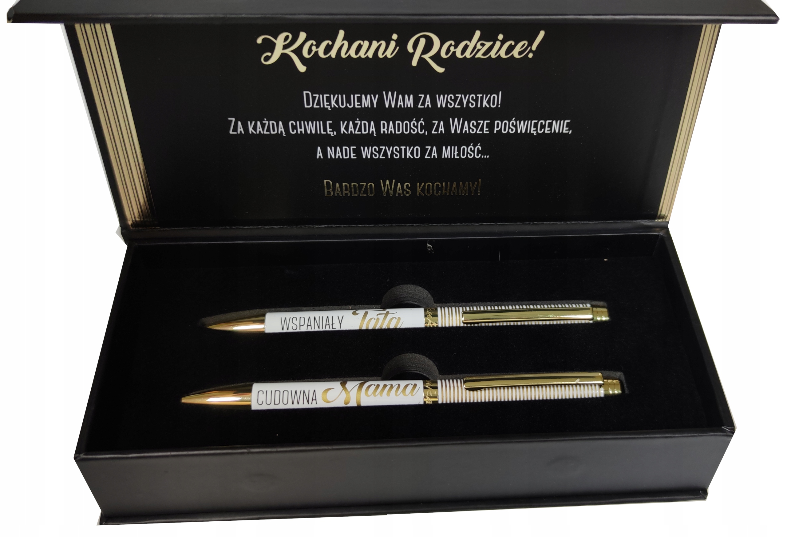У середині коробки є дві ручки з написом "Чудова мама" та "Чудовий тато" та відданість.