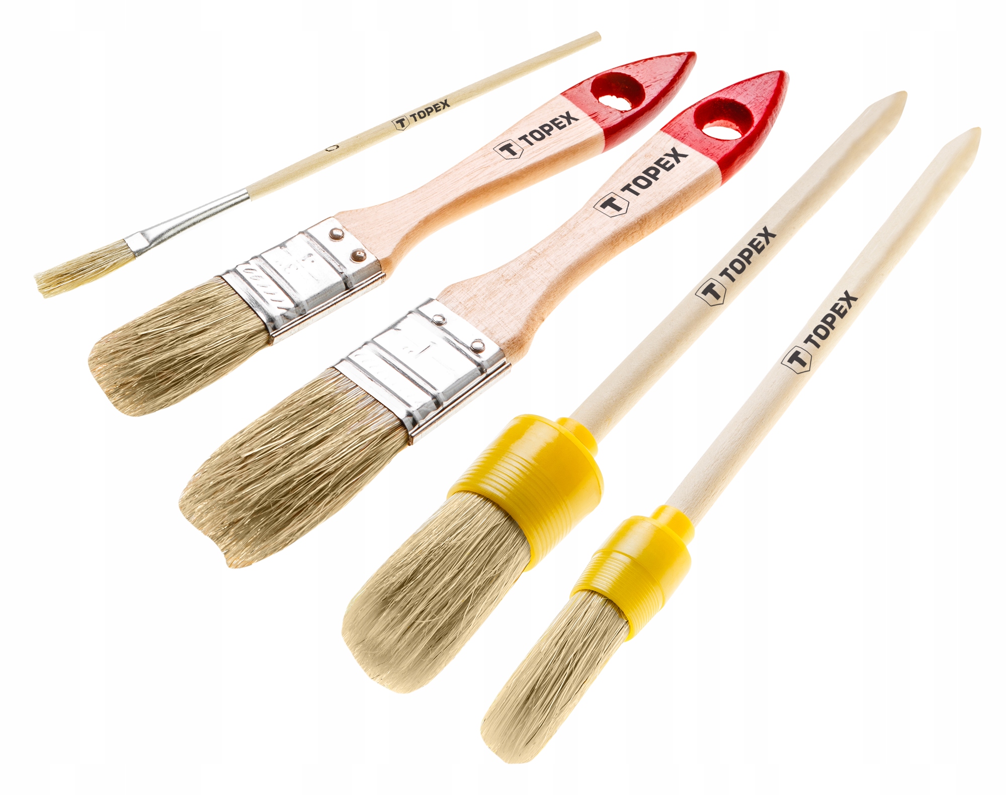 Набір кистей TOPEX (арт. № 20B816) набір включає 5 кистей, включаючи 2 плоскі кисті розміром 1" і 1,5", овальні кисті №. 2 і 4 і міні пензлик. Це щітки універсального призначення. Набір щіток TOPEX стане в нагоді для дрібних малярних і ремонтних робіт. Бренд TOPEX орієнтований на любителів DIY.