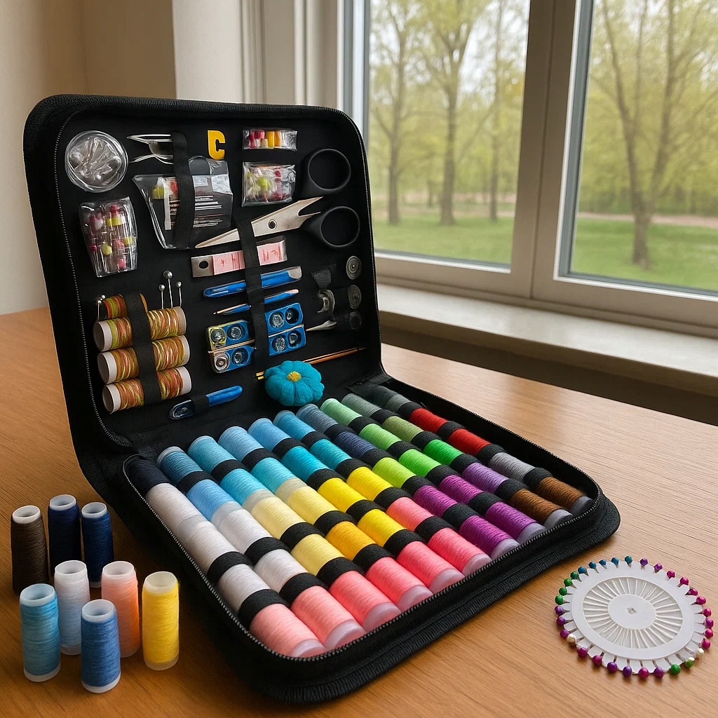 - Набір включає все, що потрібно для шиття: нитки, голки, кнопки, ножиці та інші практичні аксесуари.