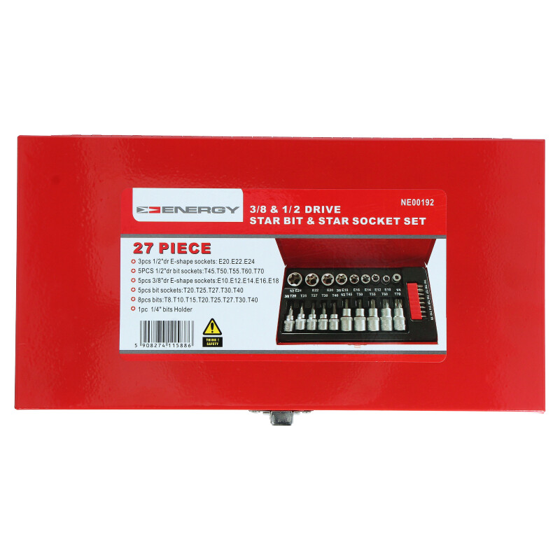 набір шматочків розетки 27 ел. Різдвяний CRV. Вкладення E-torx 1/2 ": E20, E22, E24 E-Torx 3/8": E10, E12, E14, E16, E18, CAPS 3/8 '': T20, T25, T27, T30, T40, 1/2 "Тропіки: T45, T50, T55, T60, T70, BITS: T8, T10, T15, T20, T25, T27, T30, T40, CAP до шматочків.
