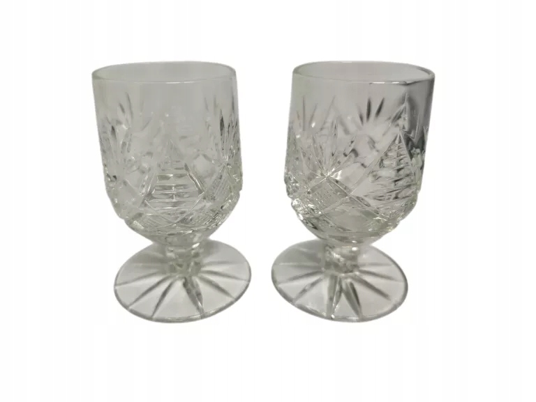 Набір з двох келихів періоду Польської Народної Республіки, виготовлений з білого кришталю, прикрашений тонкою огранкою або гравіюванням, елегантної класичної форми. Стильне скло 1970-х і 1980-х років, міцне й декоративне, типове для дизайну того часу, сьогодні розглядається як вінтажна прикраса чи колекційний сувенір із Польської Народної Республіки.