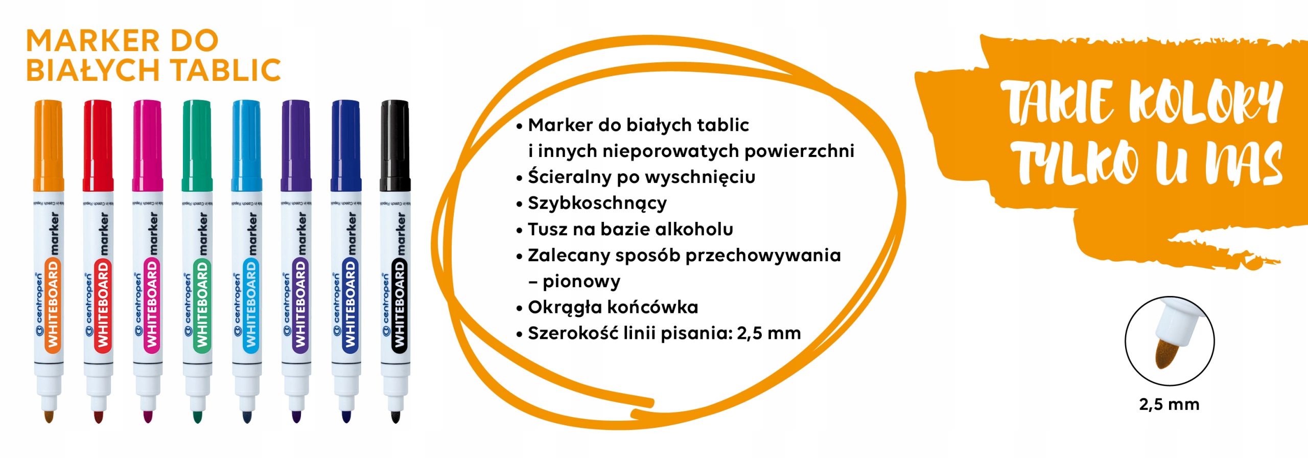 Сухостираючий маркер Centropen 8559 з насиченим кольором, розроблений для білих дошок, ідеально підходить для шкіл, де для дітей і підлітків саме кольори доводять візуальну привабливість і тим самим підвищують ефективність повідомлення.