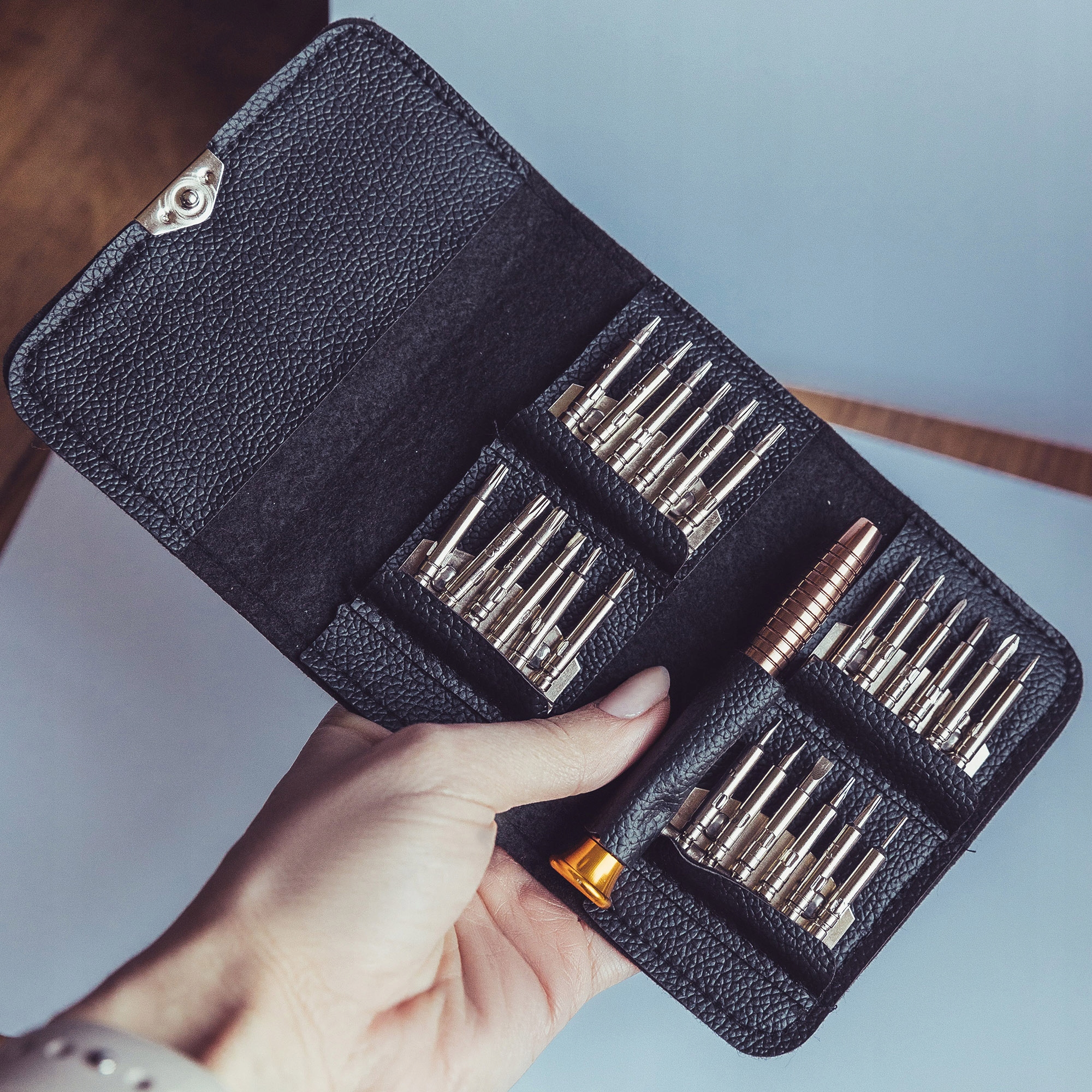 Наш аукціон включає набір прецизійних викруток. Набір містить 24 біти різного розміру, що дозволяє налаштовувати їх під конкретну діяльність і предмет, а також магнітний алюмінієвий тримач. Все це упаковано в елегантний кишеньковий футляр, який закривається затискачем.