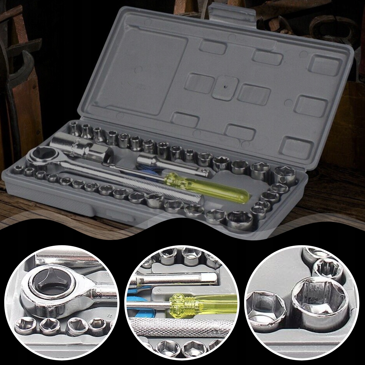 - 40 елементів, включаючи розетки в широкому діапазоні розмірів (метричних і дюймових), < /ul>