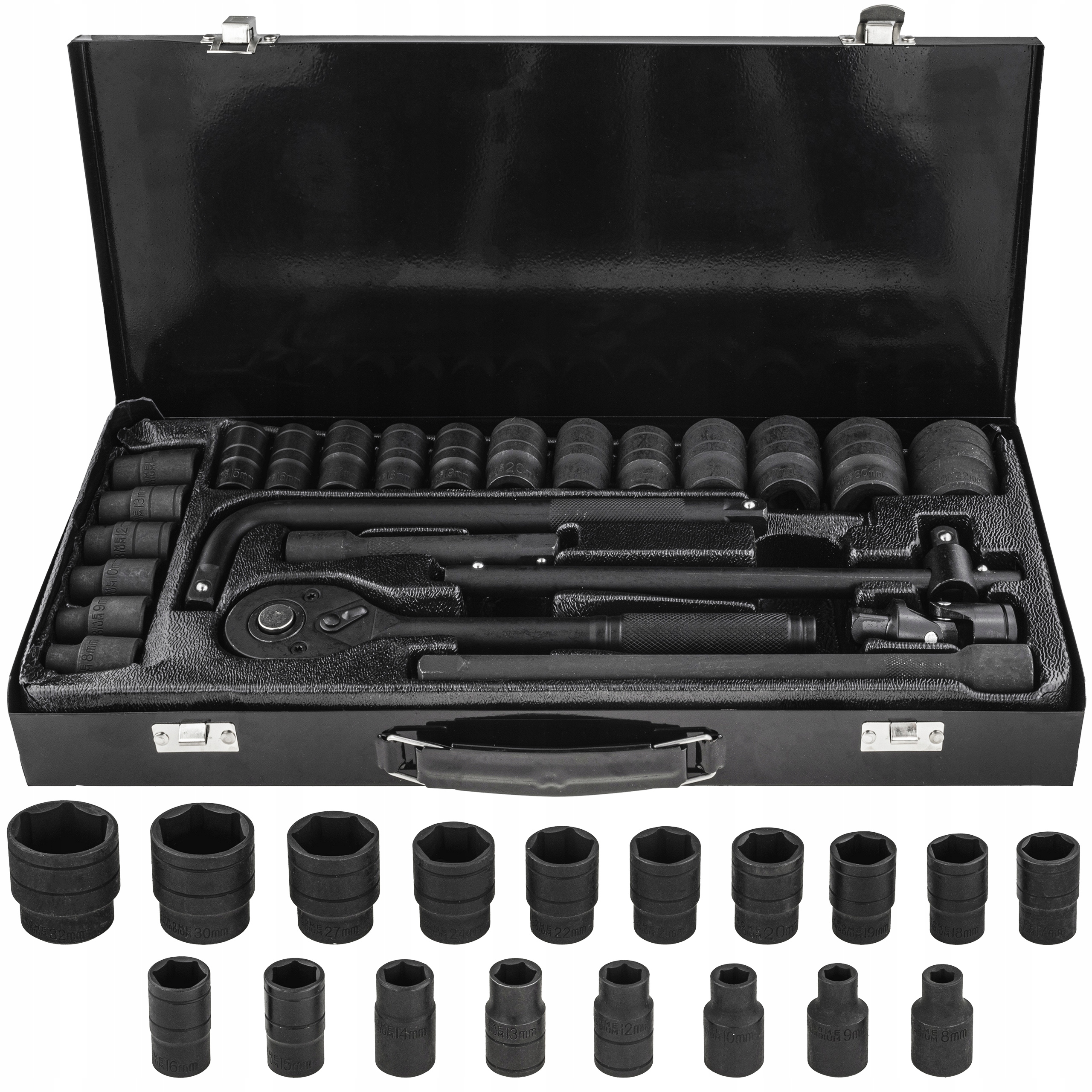 У набір входять торцеві шестигранні ключі популярних розмірів від 8 до 32 мм. Вони ідеально підходять як для домашніх гаражів своїми руками, так і для професійних послуг. Подовжувачі / ручка полегшують доступ до важкодоступних місць. Карданне з’єднання 1/2" дозволяє працювати під різними кутами, що полегшує роботу у важкодоступних місцях.