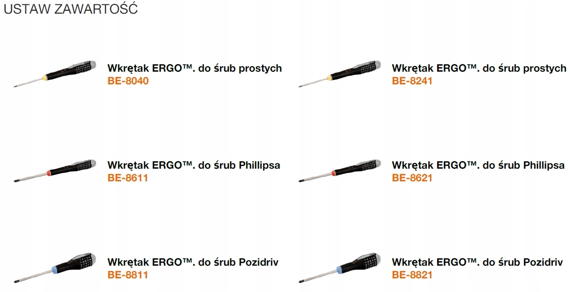 Ідеально підходить для повторюваних дій, зокрема: у виробництві в компаніях, пов’язаних з електротехнічною та автомобільною промисловістю, а також там, де є велика кількість повторюваних операцій. Набір викруток, упакованих у картонну коробку, викрутки в пластикових молдингах.