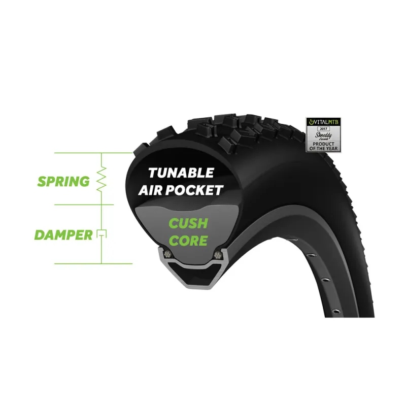 CushCore — це нова концепція: амортизація шин. Кожна система підвіски базується на пружині та демпфері, а в Cushcore повітря в накачаній шині є пружиною, а Cushcore є демпфером. Як і у випадку з традиційною підвіскою, постійне та незмінне значення демпфування не є хорошим рішенням.