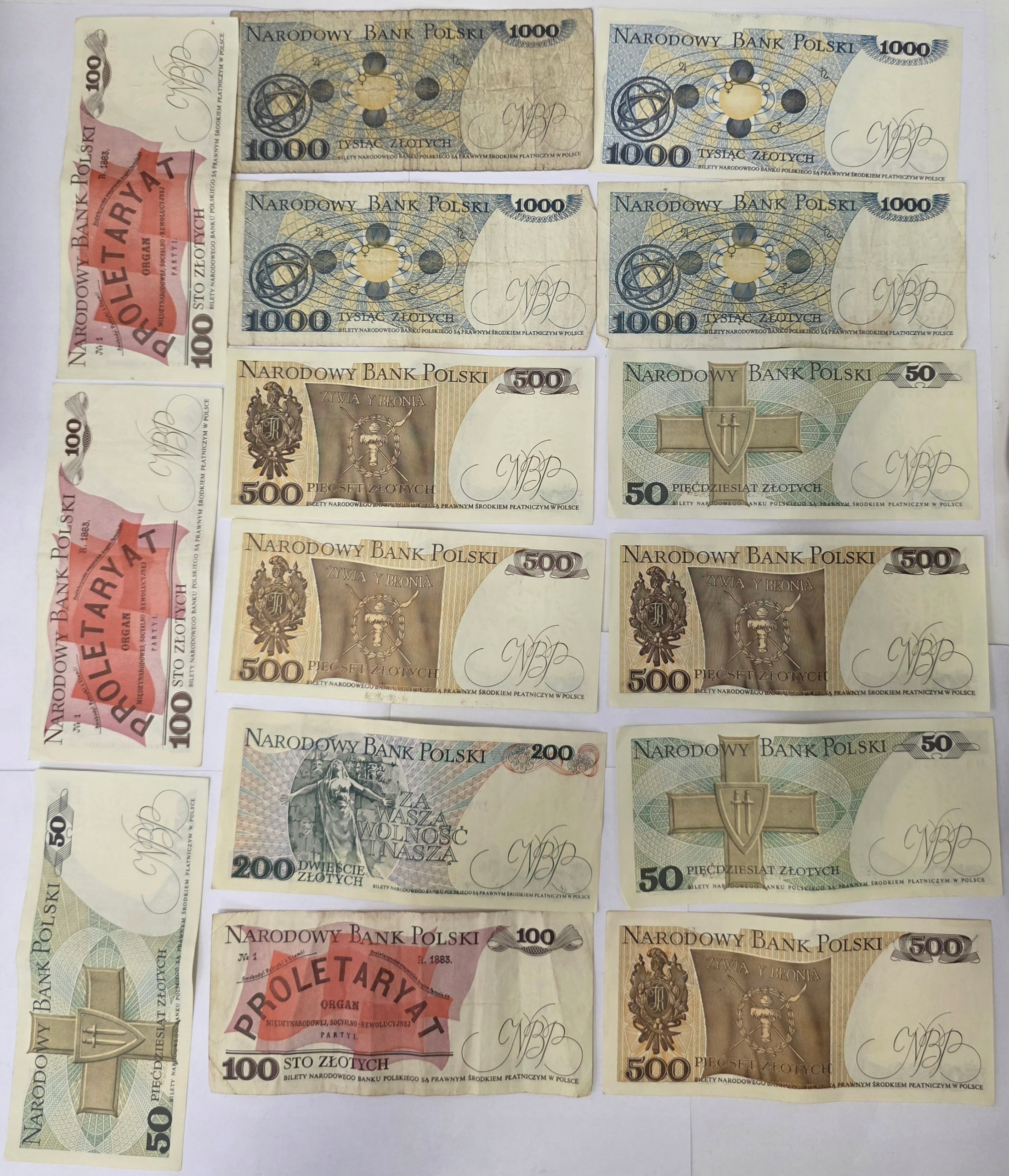- 100 злотих: банкноти червоного та рожевого кольорів із текстом «ПРОЛЕТАРЯТ» і датою «1888» на деяких реверс.