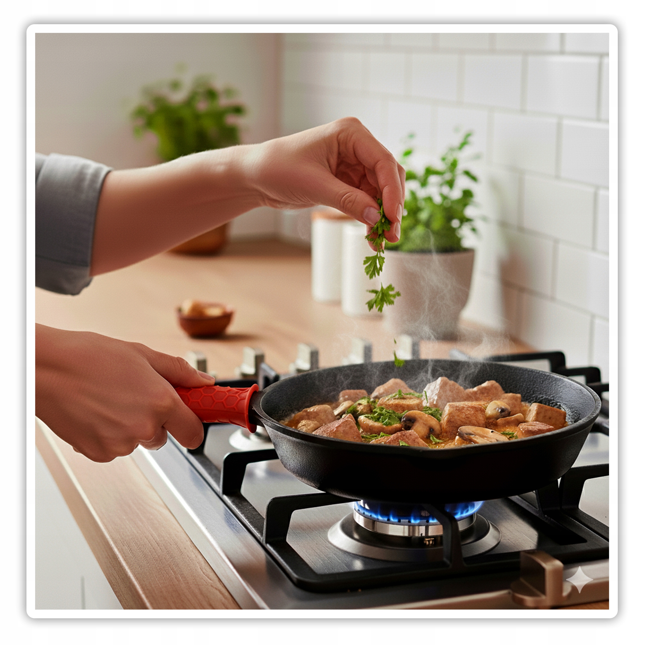 Протиковзаюча поверхня запобігає вислизанню сковороди з вашої руки, а м’який матеріал адаптується до форми ручки, збільшуючи стабільність і контроль при перенесенні.