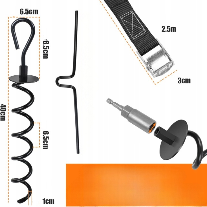 Набір ґрунтових якорів - це надійний і універсальний інструмент для прикріплення зовнішніх конструкцій. Він поєднує в собі міцність виконання зі сталевого якоря, гнучкості та міцності ременів та простоти встановлення завдяки додатковим аксесуарам. Продукт - це чудовий вибір для людей, які шукають стабільний захист батутів, наметів або альтанок у саду та в кемпінгу.