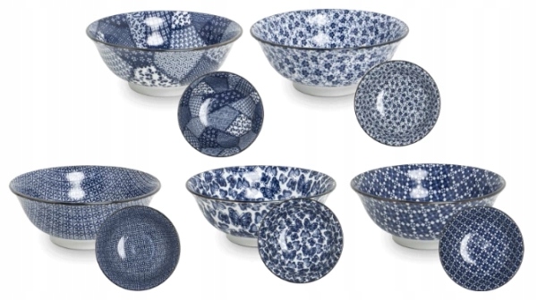 Елегантний набір з 5 мисок для супів та рисових посудів білим кольором, прикрашеними зі смаком, темно-синіми мотивами квітів, мозаїки та хитромудро пофарбованими лініями, що викликає незвичайне оптичне враження. Тонкий і практичний, він працює як випадковий посуд, так і щоденний елемент обкладинки таблиці. Оригінальні судна, що зберігаються в дусі гідної японської естетики, представлять у вашому домі справді східного персонажа та відзначатимуть будь -яку страву.
