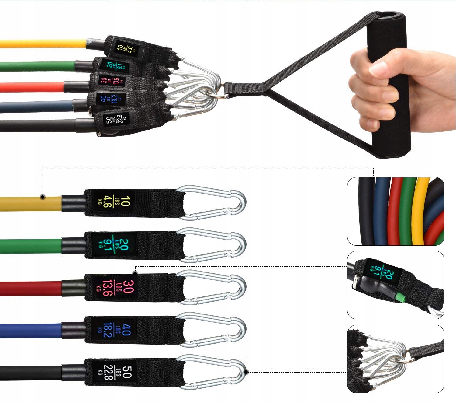 Наші стрічки для опору доступні в5 різних рівнях опору. Кожна різного кольору та опис її потужності. Ви можете додати до них стрічку, яка дає змогу прикріпити стрічки, наприклад, до штанги, щоб отримати ще більший опір.