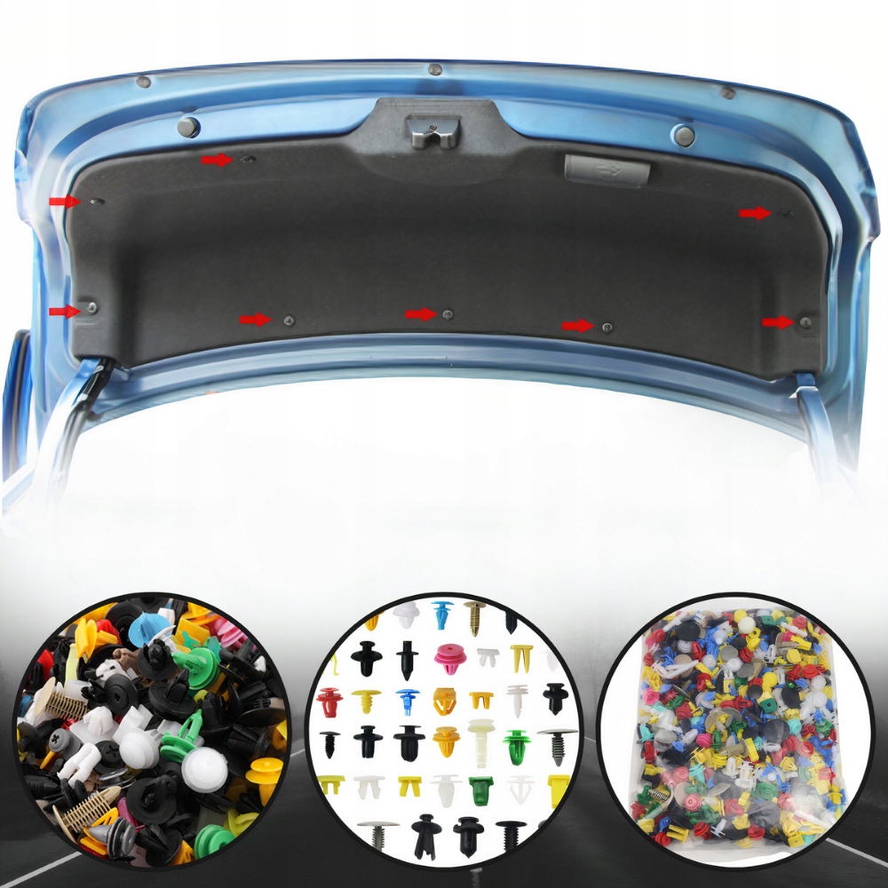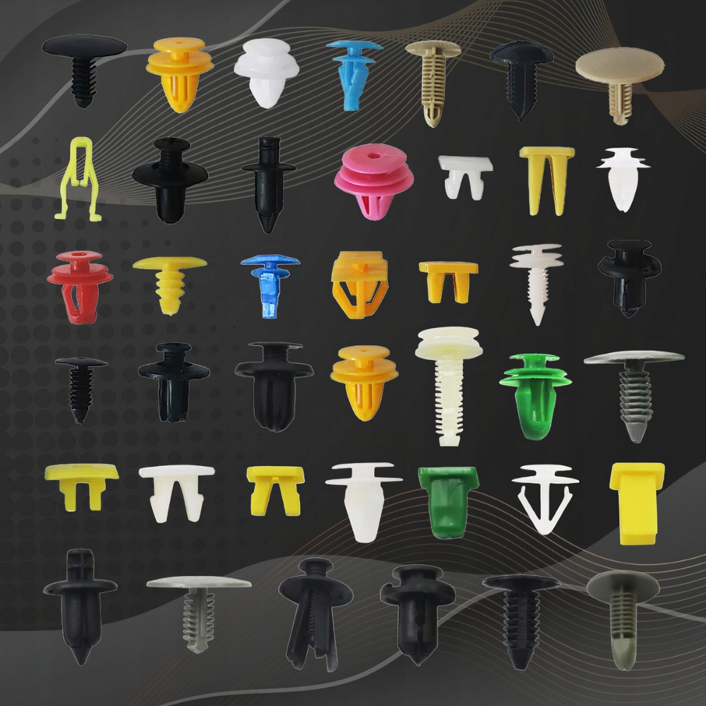 Універсальний набір аксесуарів для кріплення оббивки, пластику, бамперів, ущільнювачів тощо в автомобілі, включає шпильки, шпильки, кліпси та засувки стандартних розмірів, які зазвичай використовується в більшості марок автомобілів.