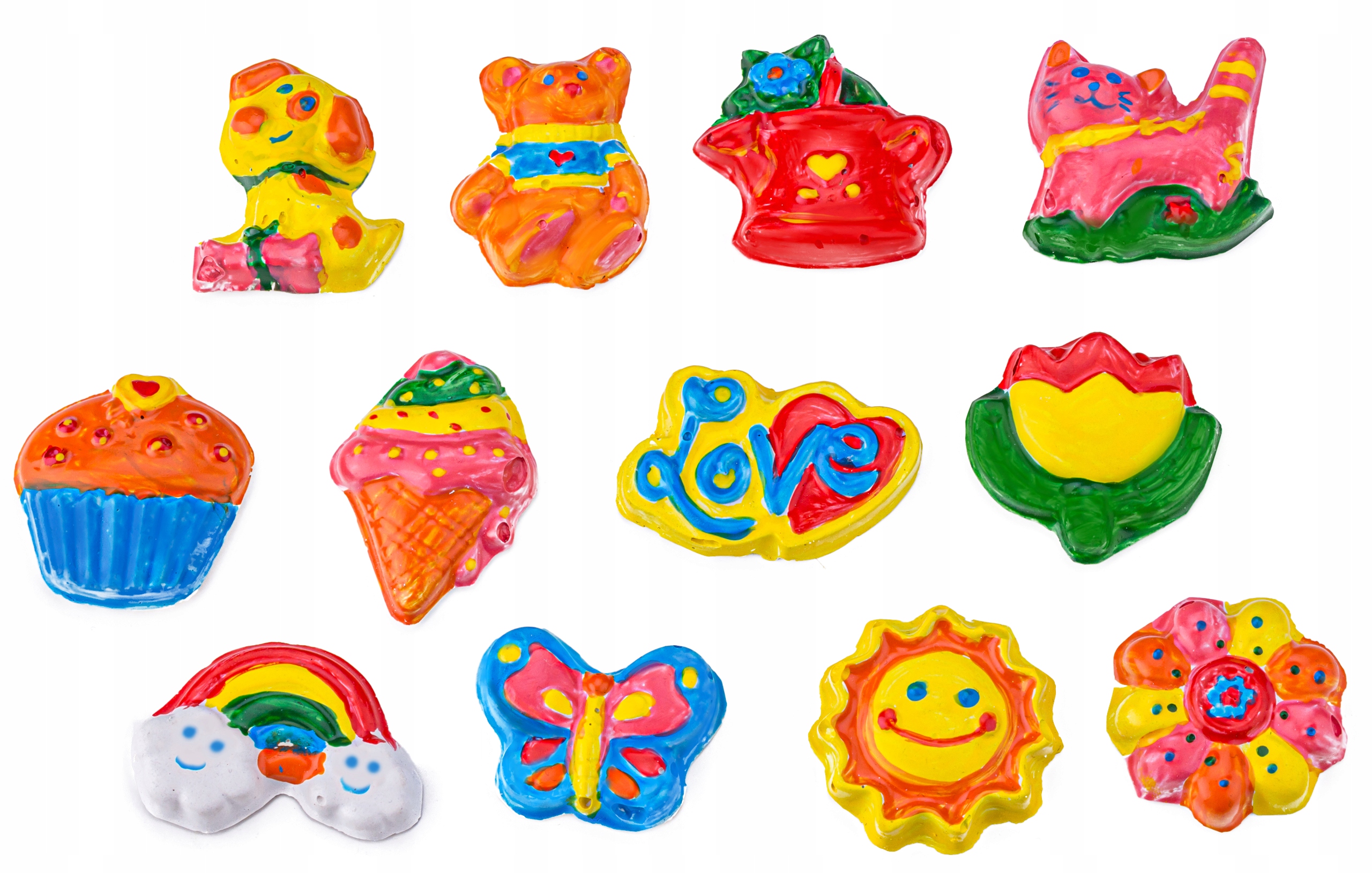 Змішайте гіпс у пропорціях відповідно до інструкції. Готову суміш вилийте у форму і почекайте, поки вона застигне. Видавивши виливки з форми, ми розфарбовуємо їх відповідно до наших уподобань. Фотографія з коробки наведена лише для ілюстрації, і набір може містити кольори фарби інших відтінків, ніж ті, що вказані на упаковці. Відкладіть намальовані візерунки в сторону, поки фарба не висохне. При необхідності можна нанести другий шар. Наклейте вирізаний шматочок магніту на готові зліпки і готово :)