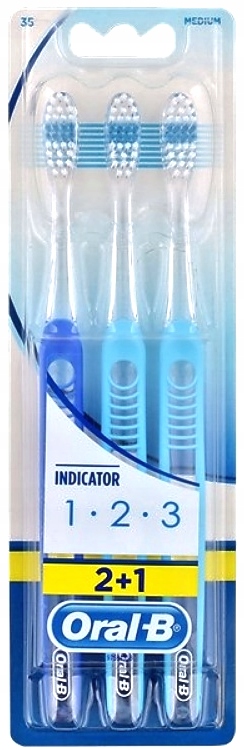Зубна щітка Oral-B Indicator 3-Toothbrush містить спеціальну блакитну щетину, яка поступово тьмяніє під час використання, щоб вказати, коли її потрібно замінити .