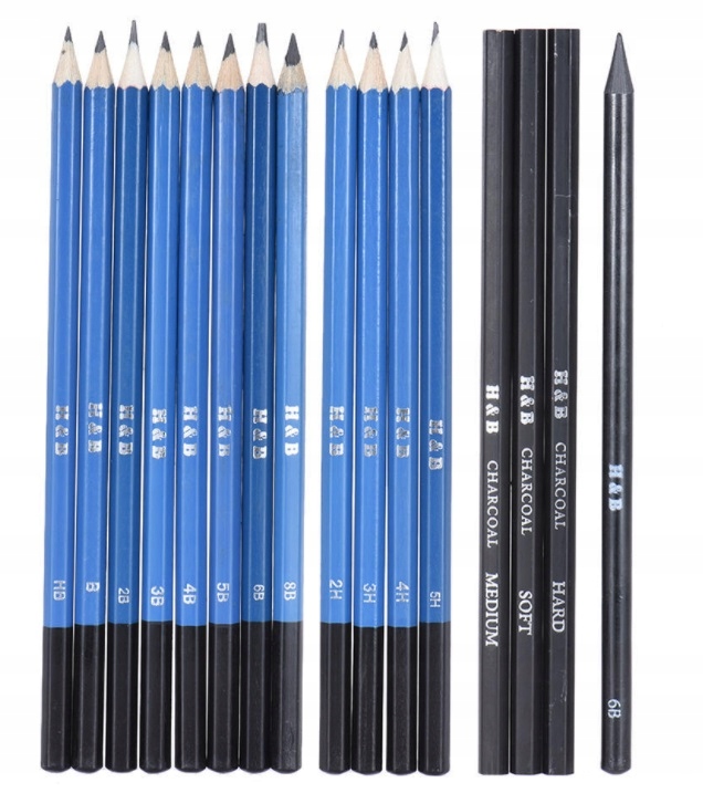 - олівці - 12 олівців для малювання, 3 вугільні олівці (м’який, середній, твердий) і 1 графітний олівець 6B; висока якість виготовлення забезпечує комфорт використання та довгий термін служби,