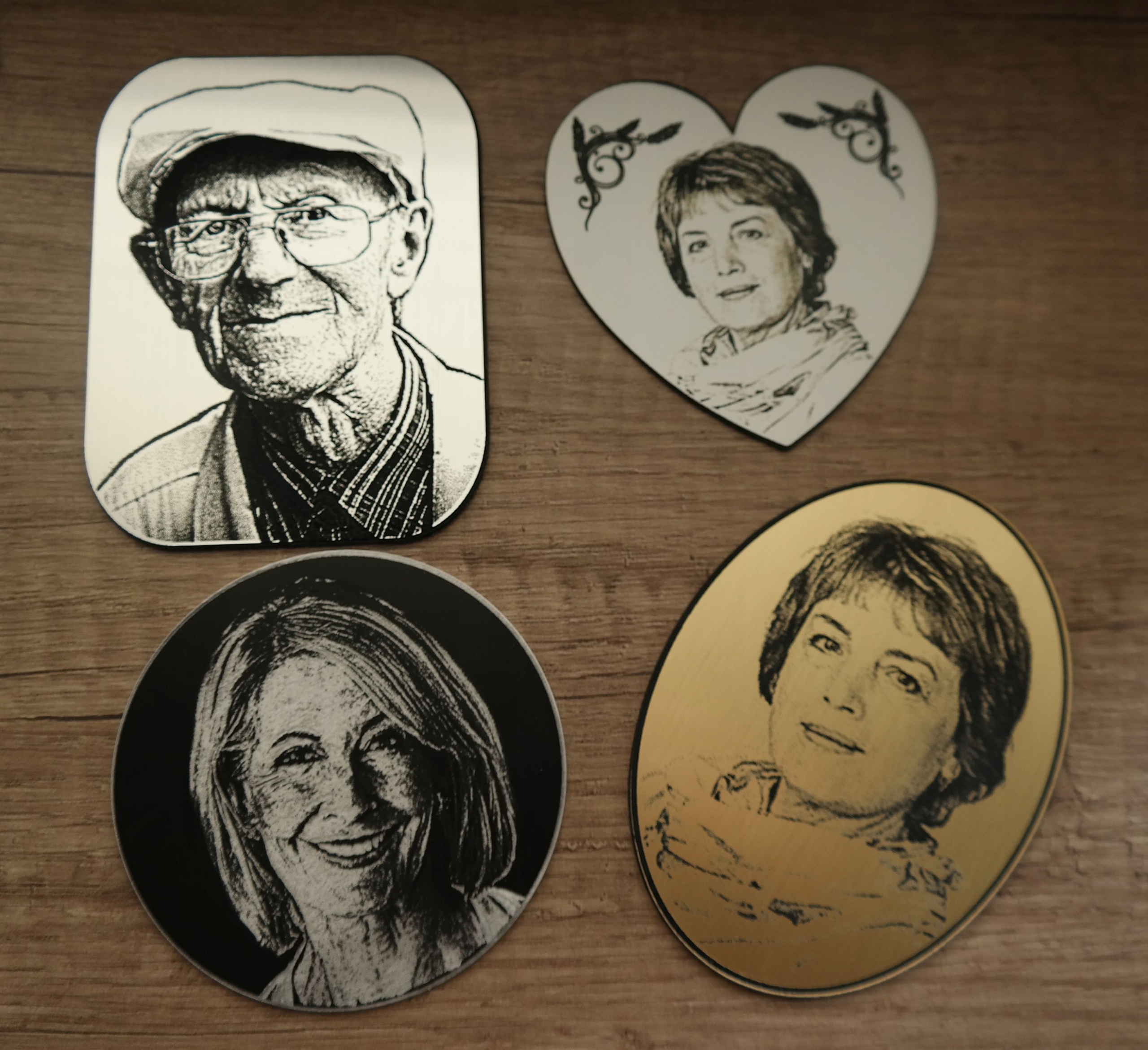 Кольори на вибір: золотий, срібний з чорним гравіюванням, чорний з білим гравіюванням і білий з чорним гравіюванням (фото на чорному ламінаті вигравірувано в негативі).